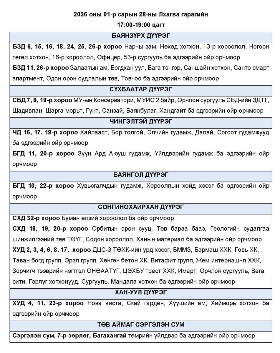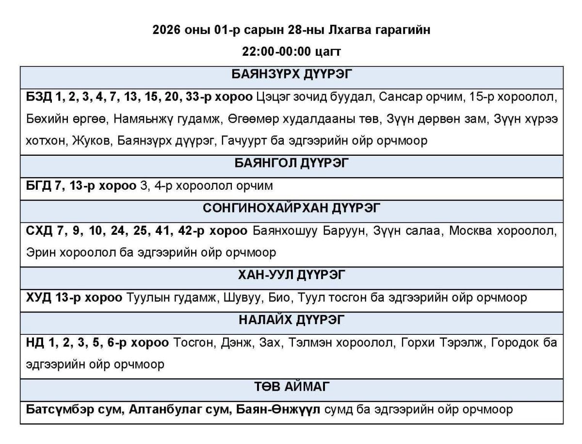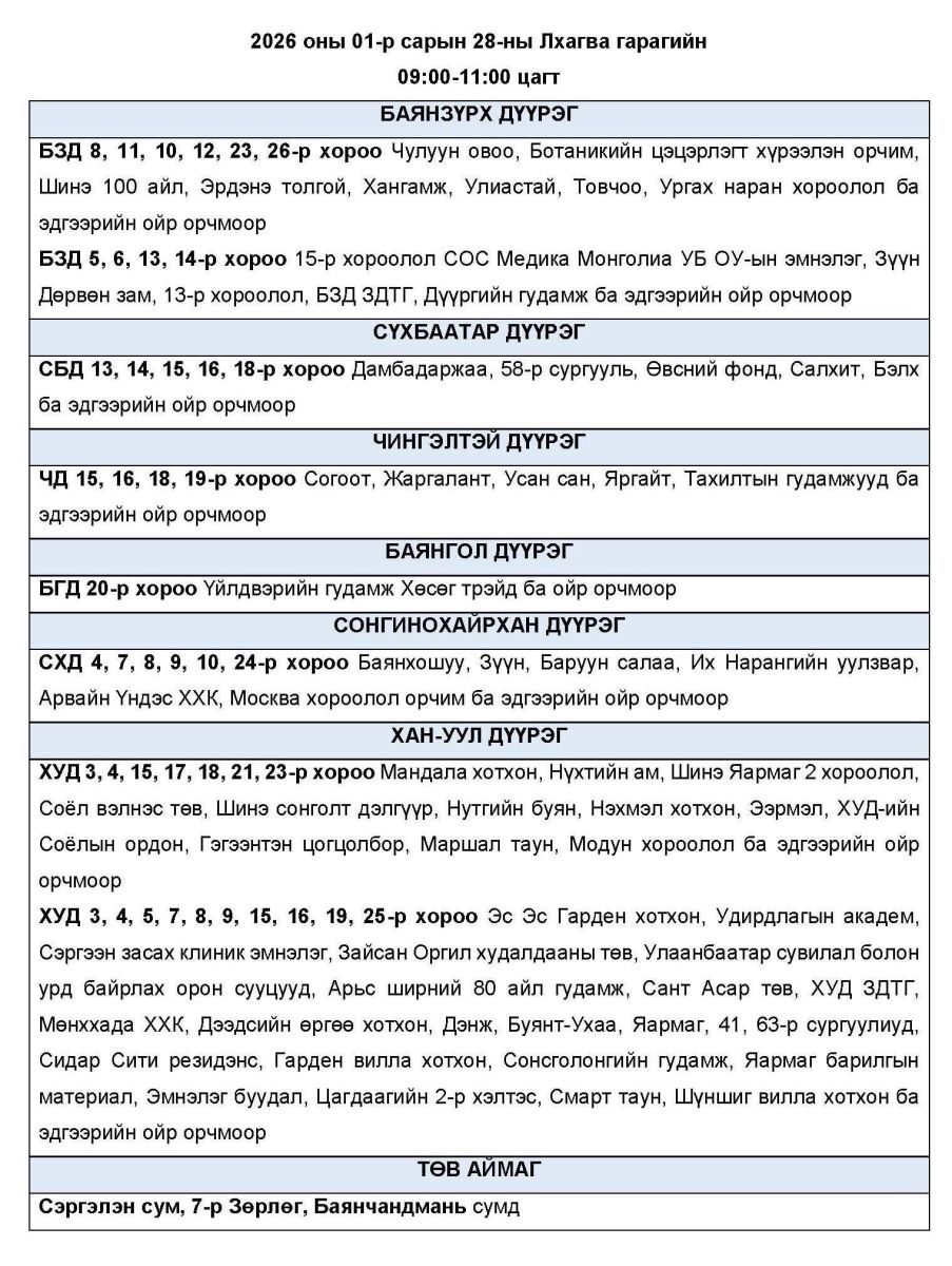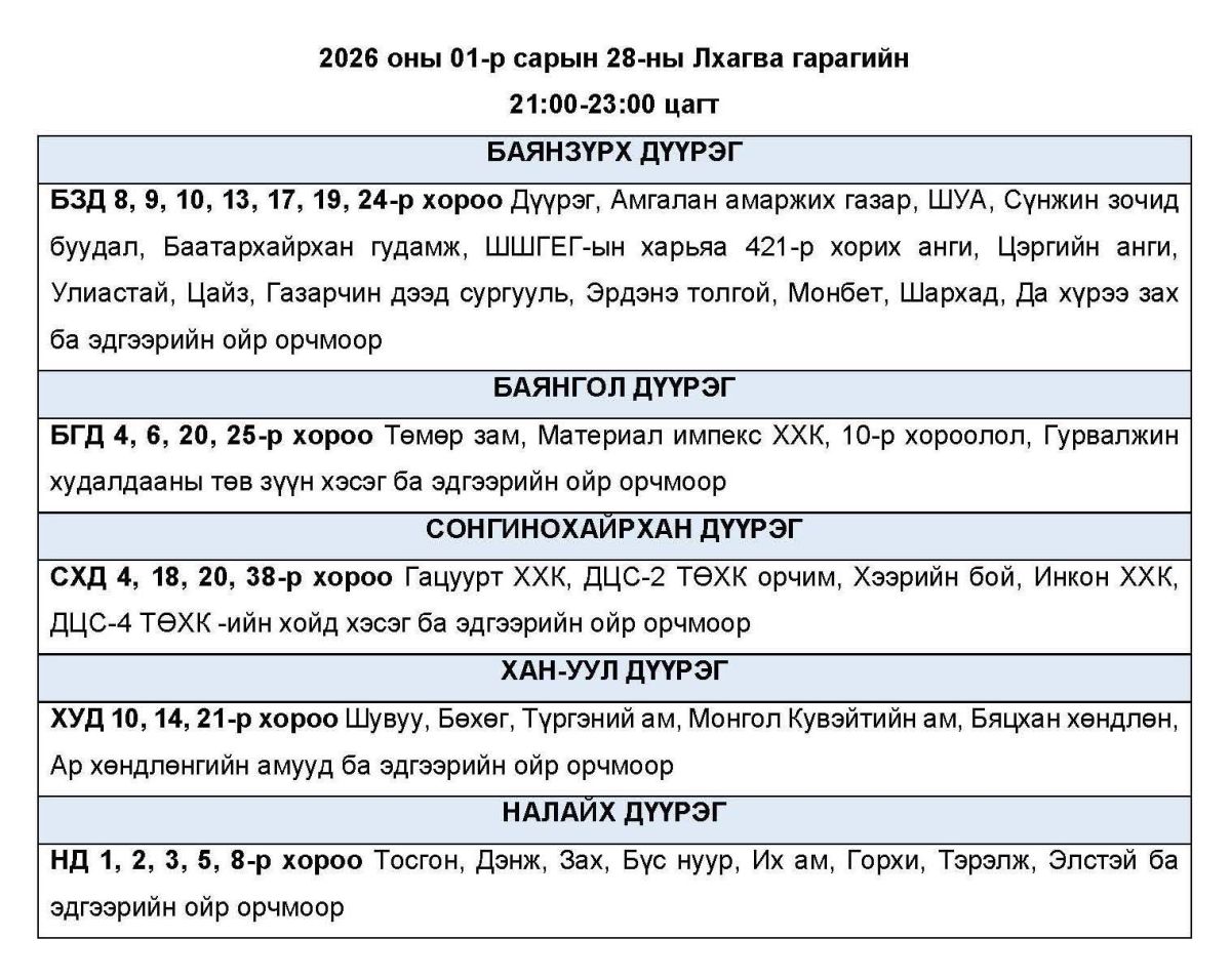 2026 оны нэгдүгээр сарын 28-ны 09:00 цагаас эхлэн цахилгаан хязгаарлах хуваарийг Улаанбаатар Цахилгаан Түгээх Сүлжээ(УБЦТС) ТӨХК-аас мэдээллээ.