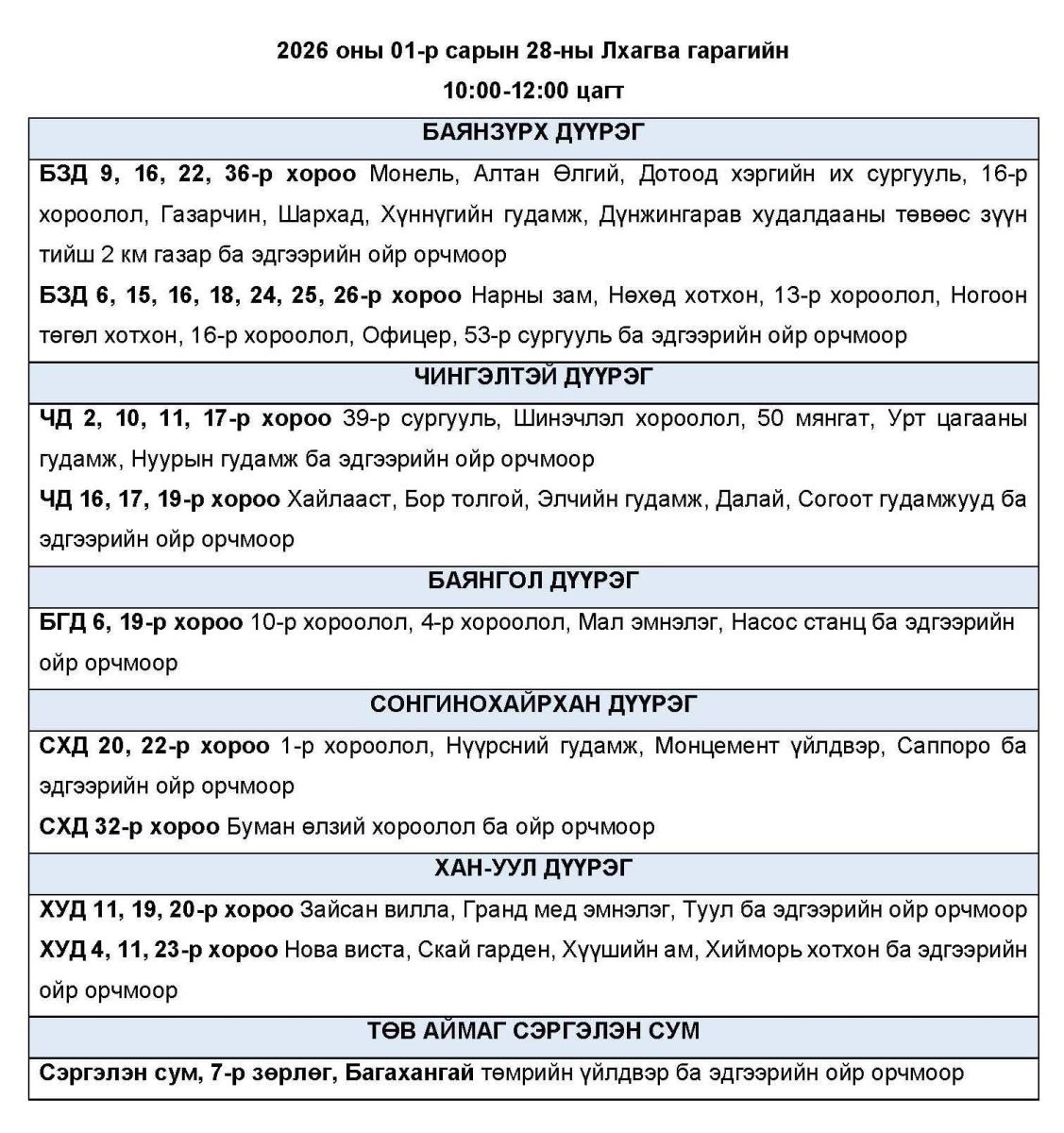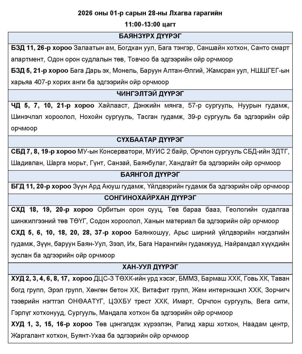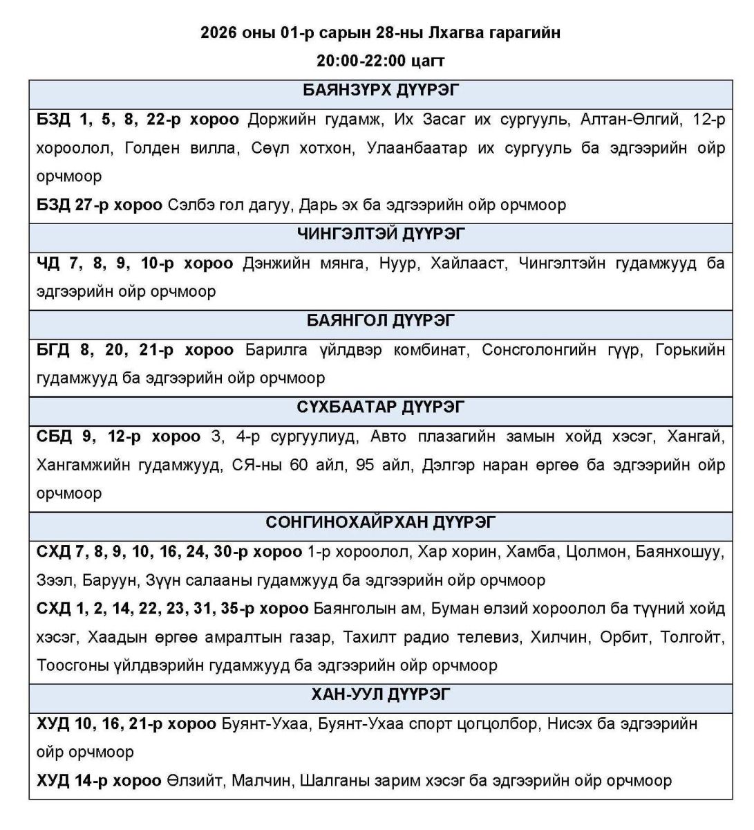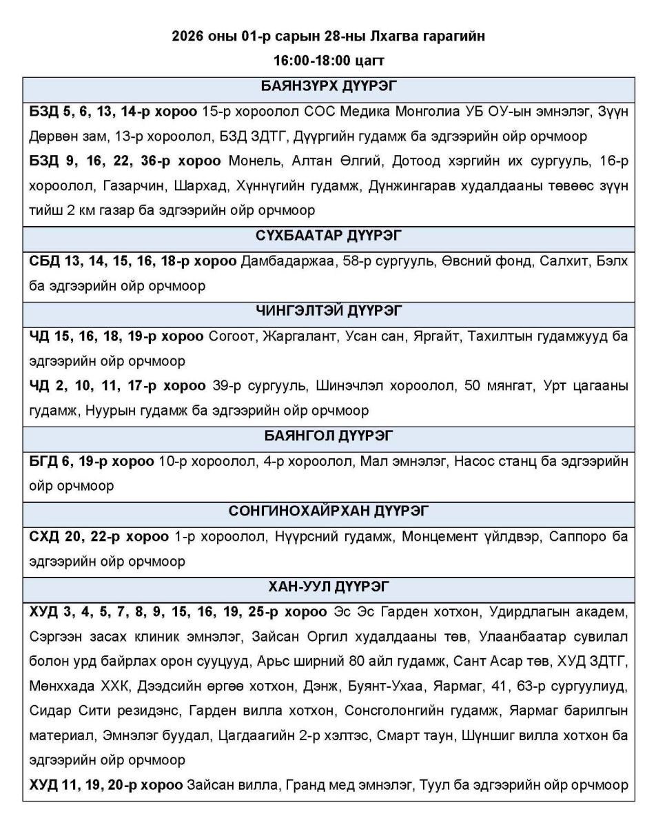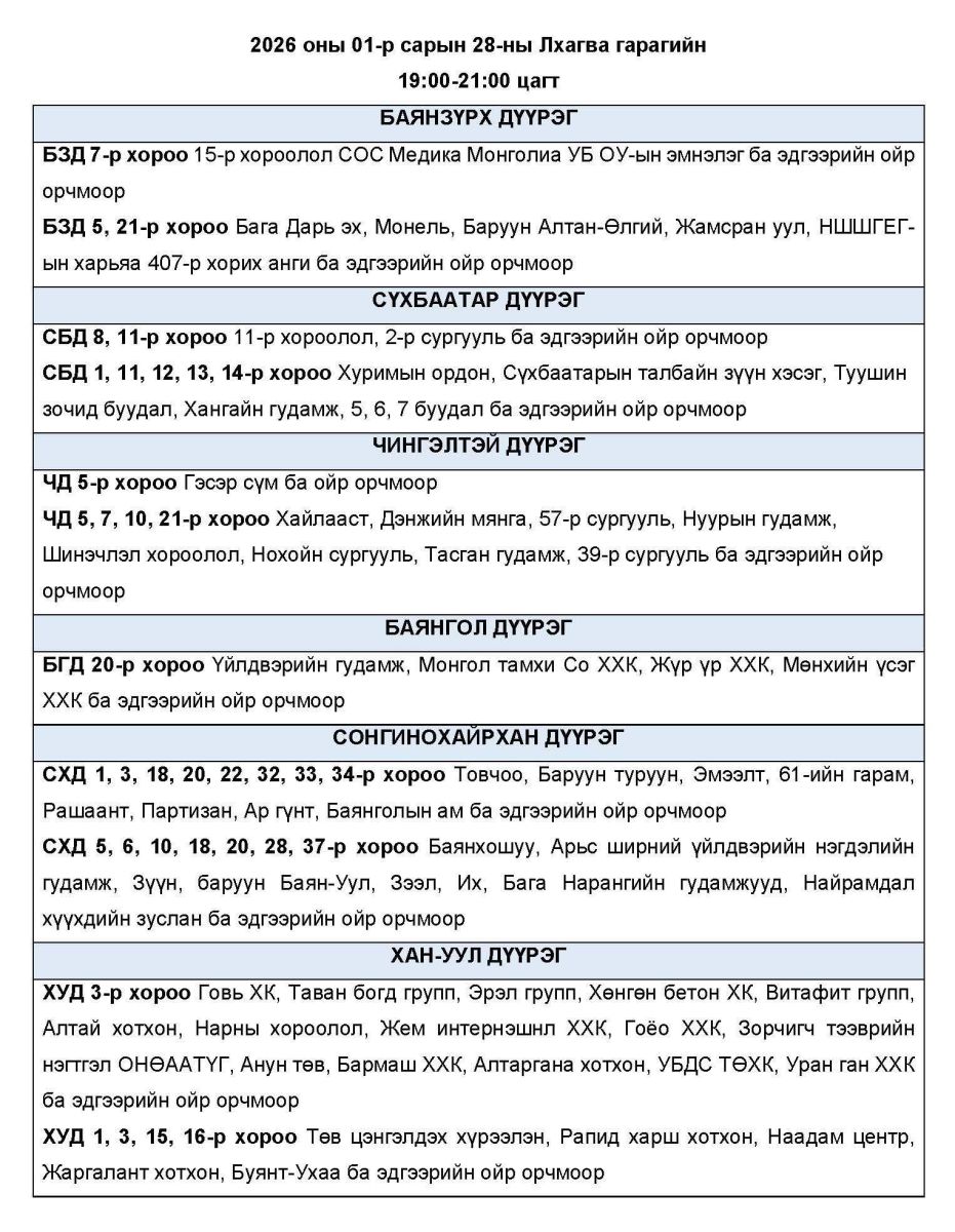 2026 оны нэгдүгээр сарын 28-ны 09:00 цагаас эхлэн цахилгаан хязгаарлах хуваарийг Улаанбаатар Цахилгаан Түгээх Сүлжээ(УБЦТС) ТӨХК-аас мэдээллээ.