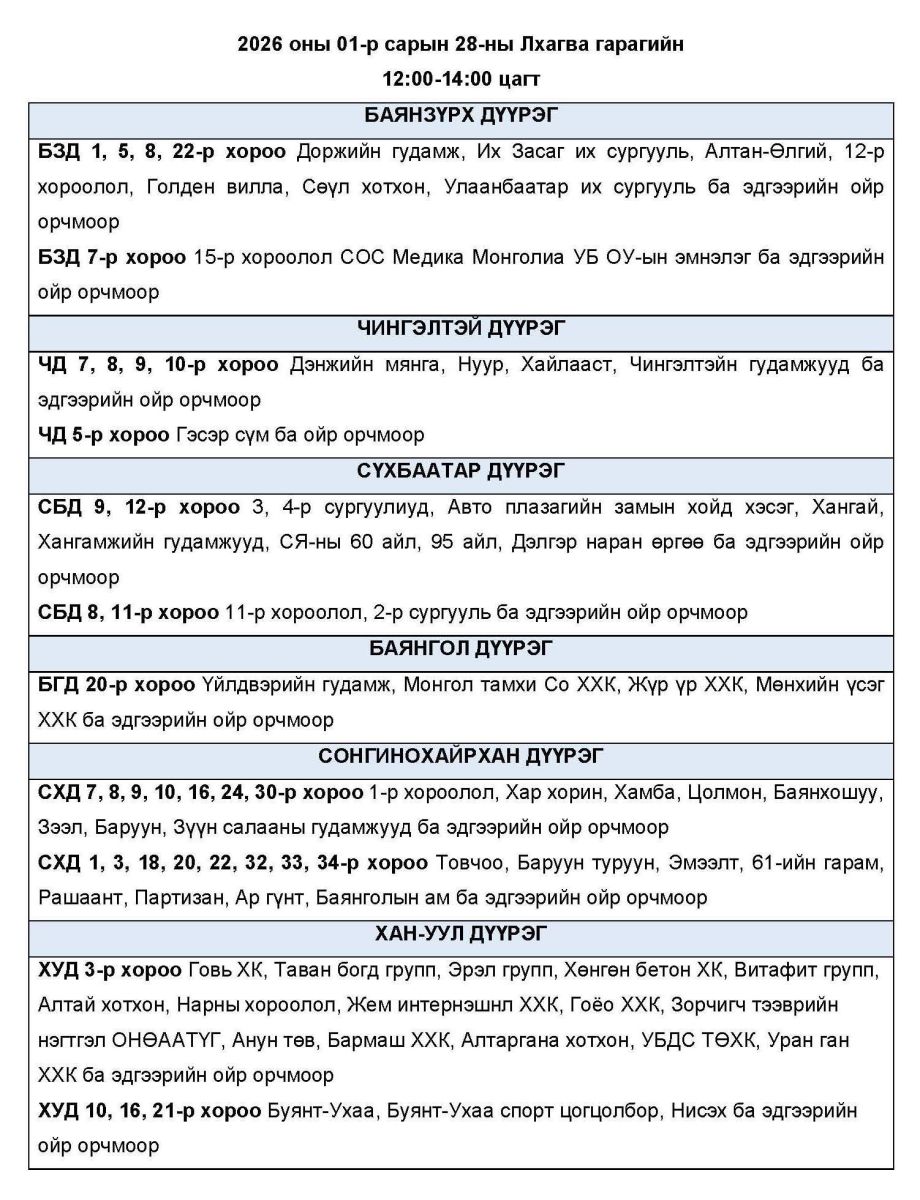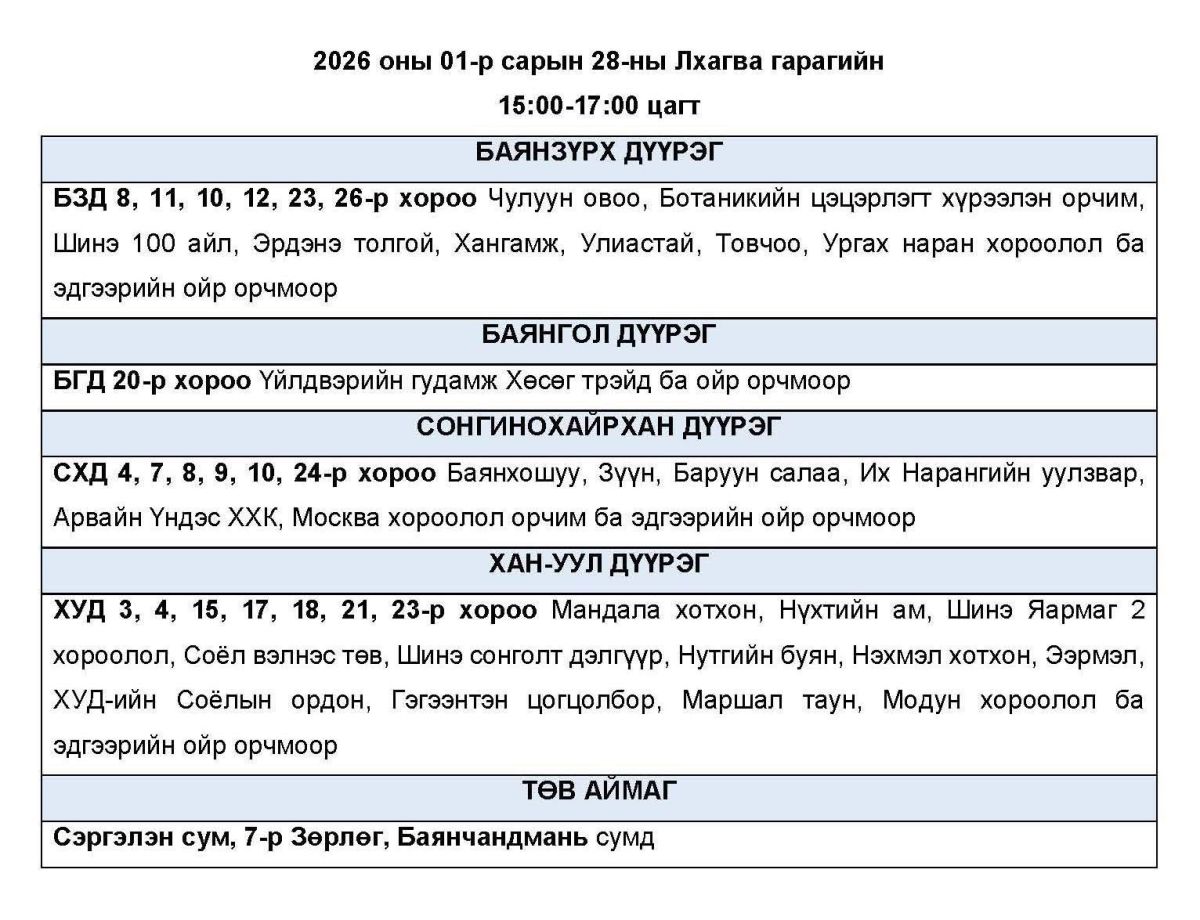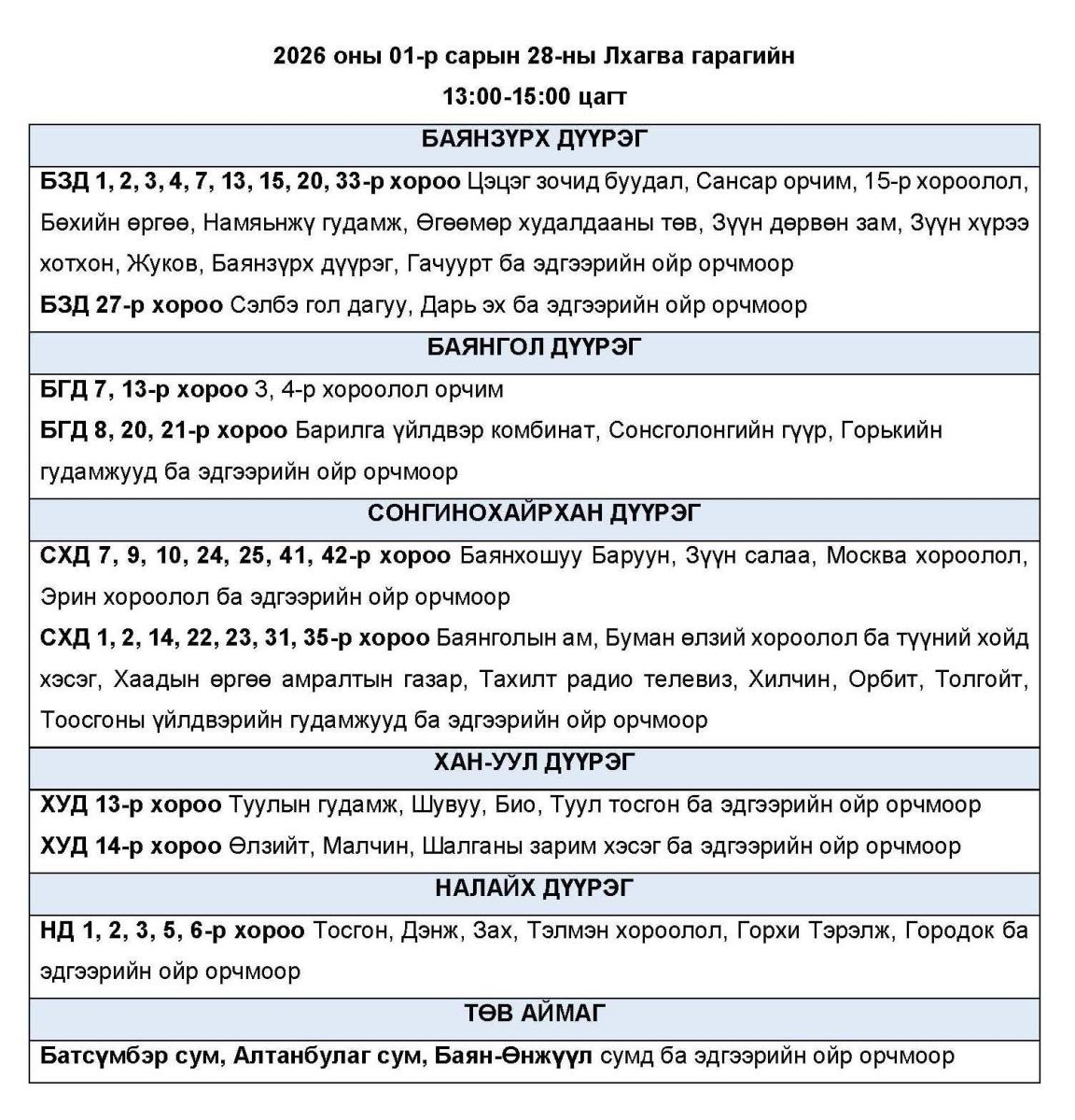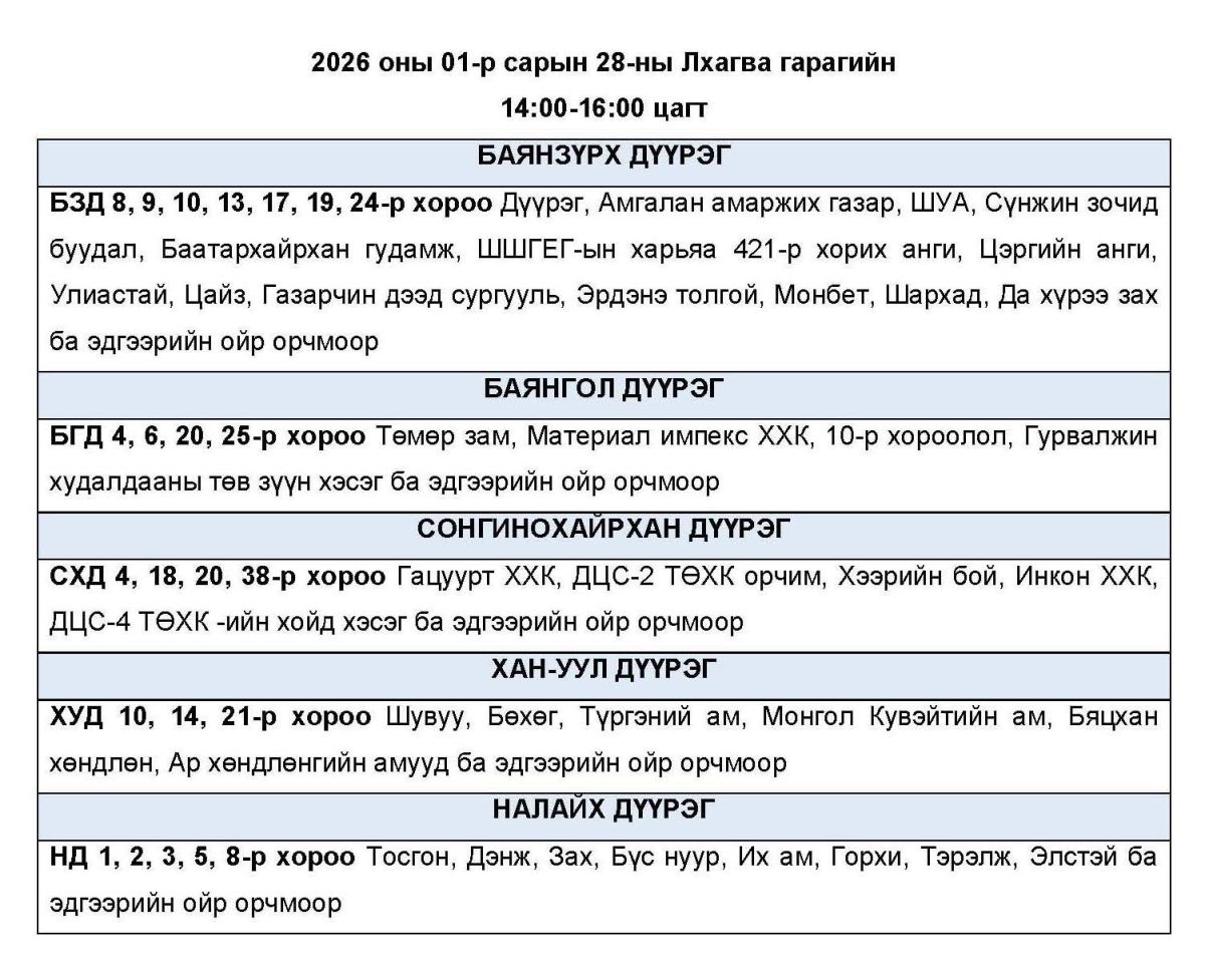 2026 оны нэгдүгээр сарын 28-ны 09:00 цагаас эхлэн цахилгаан хязгаарлах хуваарийг Улаанбаатар Цахилгаан Түгээх Сүлжээ(УБЦТС) ТӨХК-аас мэдээллээ.