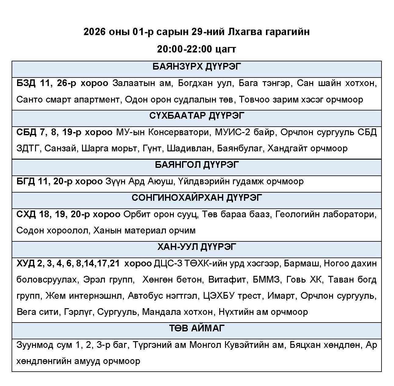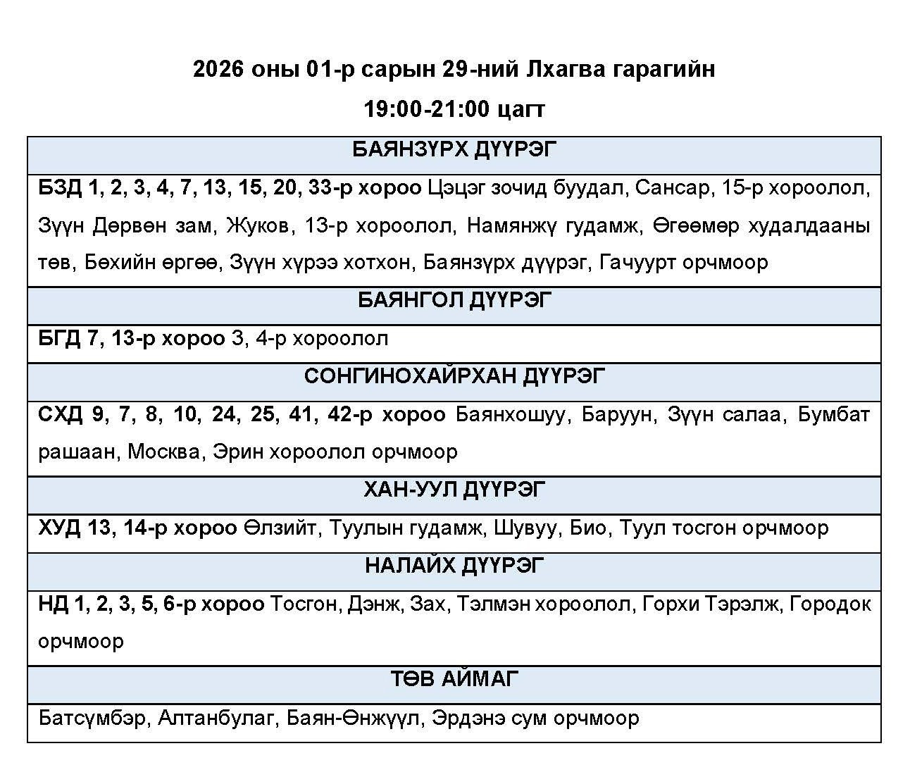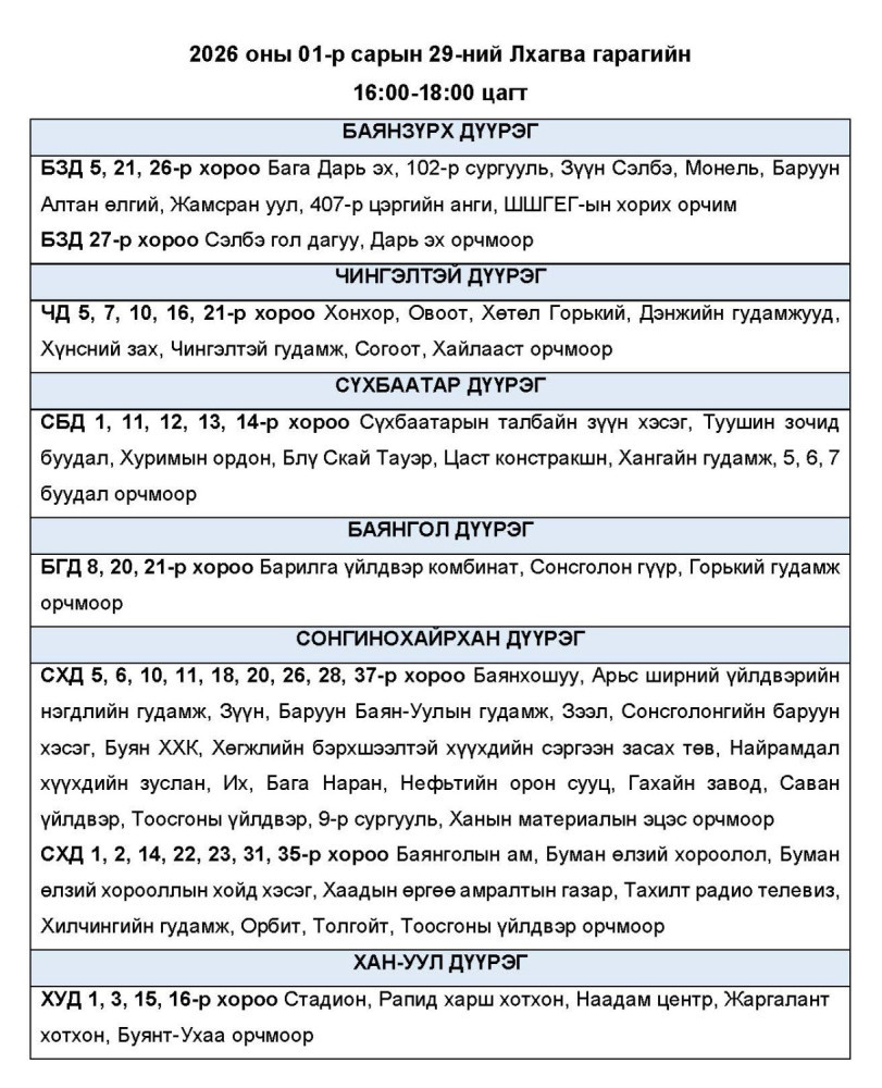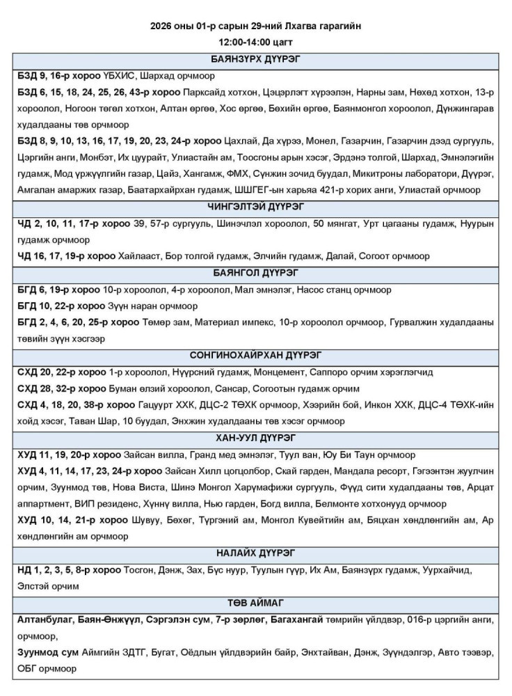 Өнөөдөр буюу 2026.01.29-ний пүрэв гарагт цахилгаан хязгаарлах байршлуудыг УБЦТС ТӨХК-аас мэдээллээ. Хуваарийн дагуу 23:00 цаг хүртэл цахилгаан хязгаарлахаар байна.