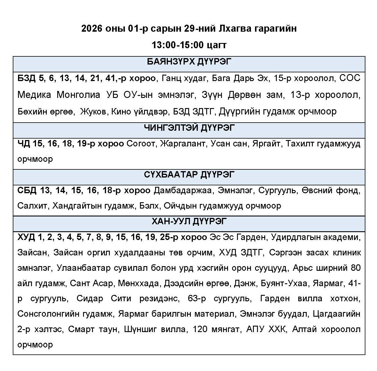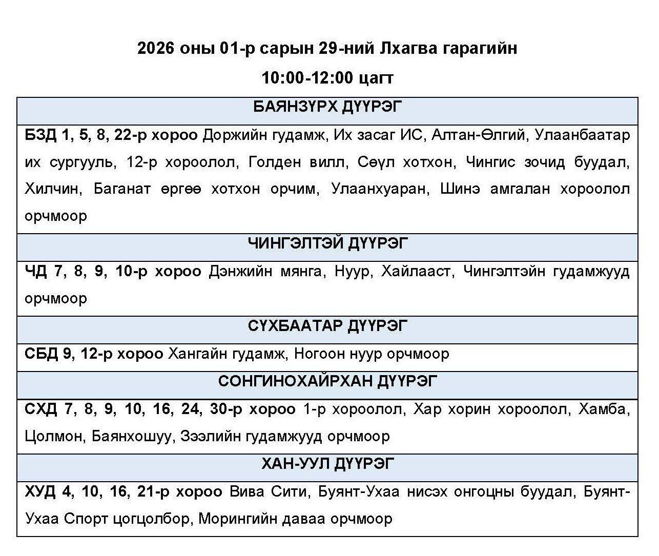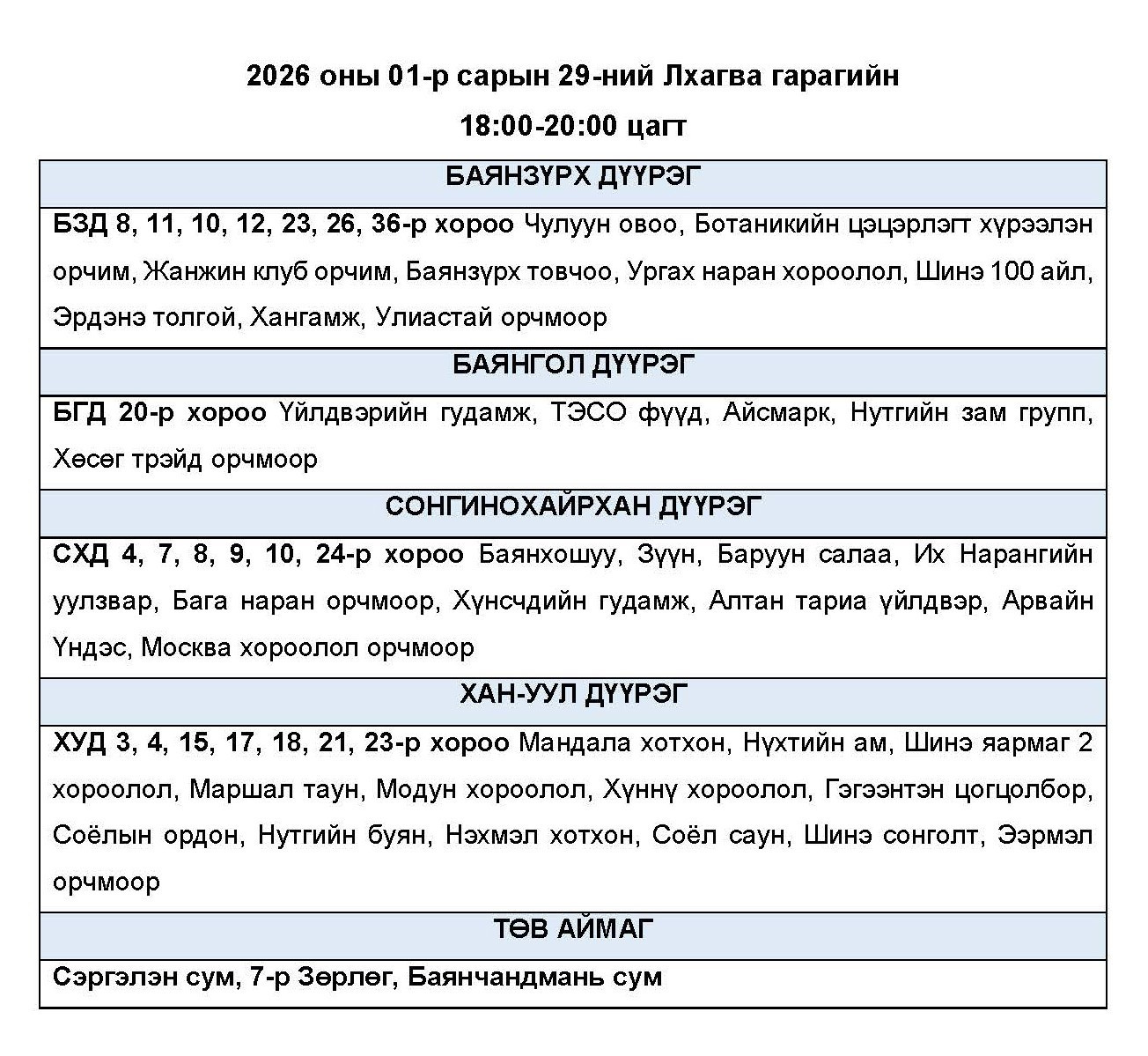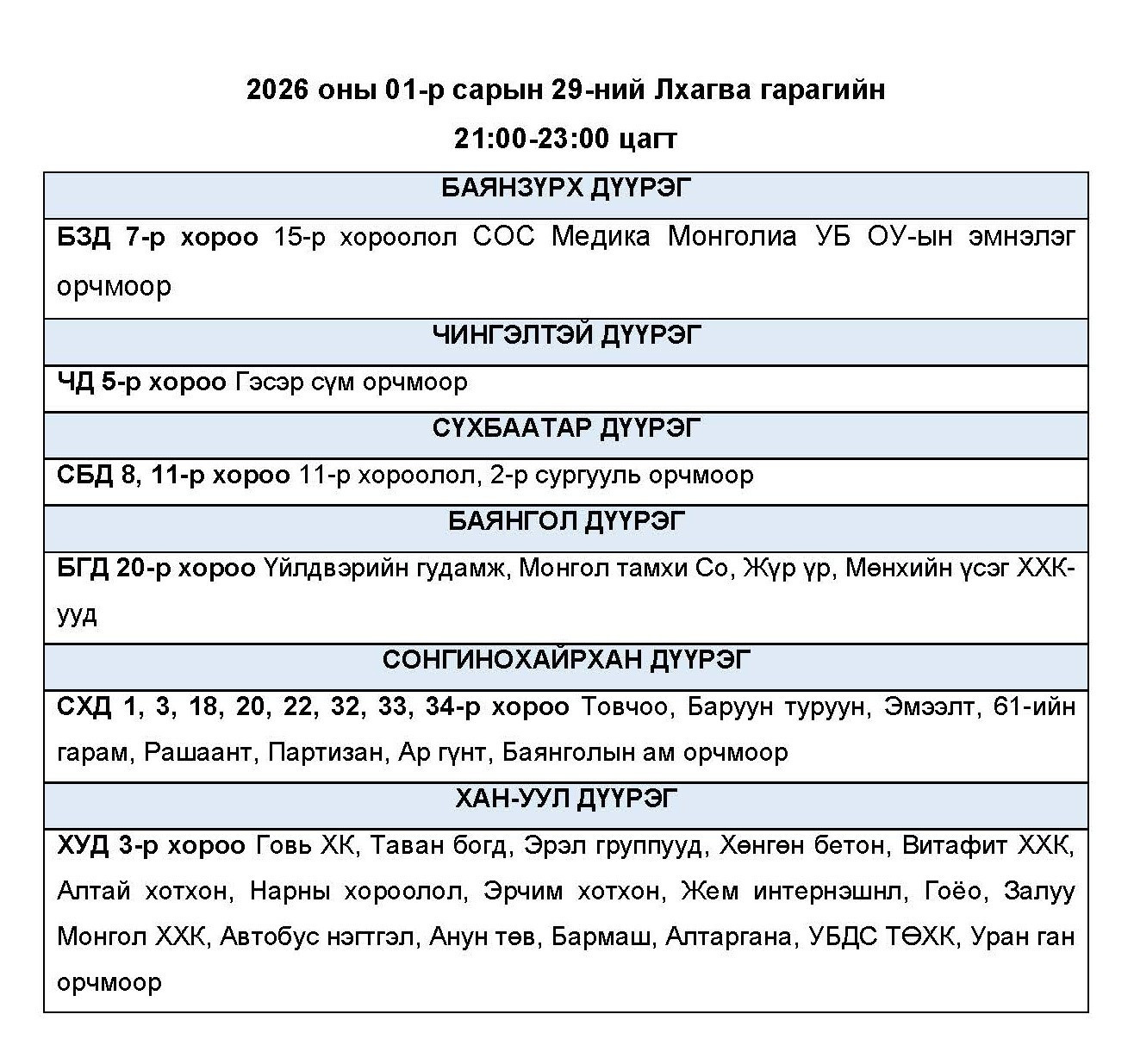 Өнөөдөр буюу 2026.01.29-ний пүрэв гарагт цахилгаан хязгаарлах байршлуудыг УБЦТС ТӨХК-аас мэдээллээ. Хуваарийн дагуу 23:00 цаг хүртэл цахилгаан хязгаарлахаар байна.
