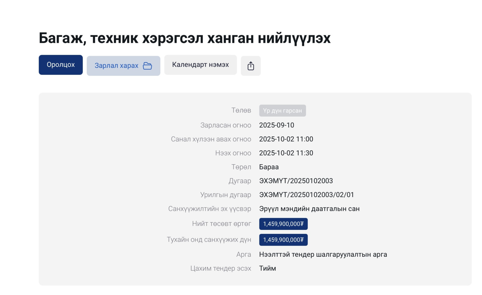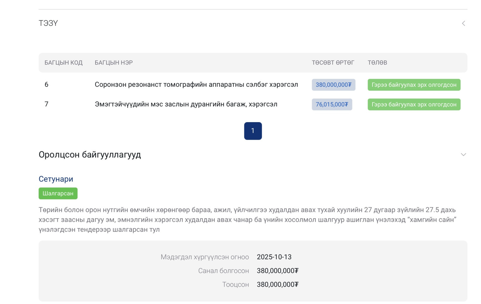 Энэ талаар Эрүүл мэндийн сайд Ж.Чинбүрэн, “ЭХЭМҮТ-ийн MRI аппарат эвдрээд, засвар хийх 500 сая төгрөгийг шийдэж өгсөн ч ажил удаашралтай байгаа” тухай мэдээлж байсан. Тэгвэл олон сар MRI аппаратгүй байсан ЭХЭМҮТ өнгөрсөн оны есдүгээр сард 1 тэрбум 459 сая 900 мянган төгрөгийн "Багаж, техник хэрэгсэл ханган нийлүүлэх" тендер зарласан бөгөөд үүн дотроо Соронзон резонанст томографийн аппаратны сэлбэг хэрэгсэл худалдан авах 380 сая төгрөгийн тендерийг багтаажээ. Уг тендерт Б.Бямбажаргал өмчлөгтэй “Сетунари” гэх компани шалгарсан байна.