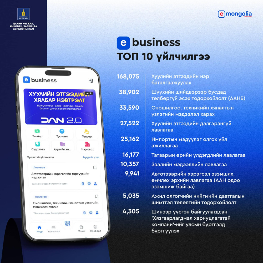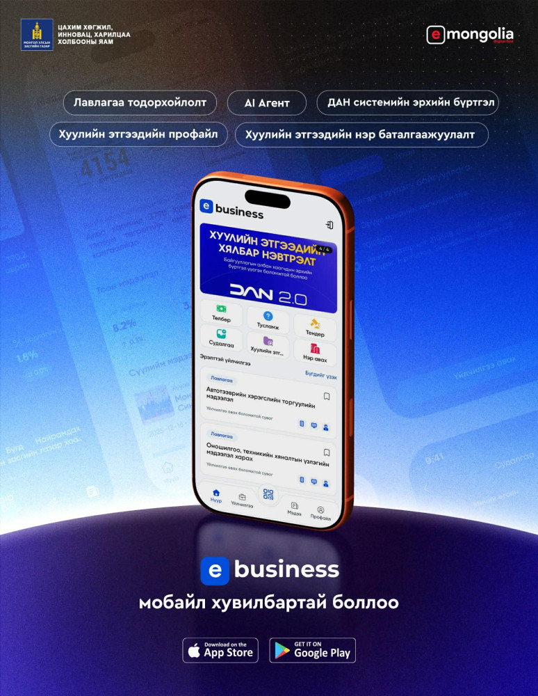 Монгол Улсын засгийн газраас баталсан "Цахимаар нэн тэргүүнд” бодлогын зөвлөмжийн хүрээнд төрийн бүтээмжийг нэмэгдүүлэх, цахим шилжилтийг эрчимжүүлэх ажил үе шаттай хийгдэж байна. "Төрийн үйлчилгээний нэгдсэн E-Business платформ мобайл аппликейшн 2026.01.30-ний өдрөөс хэрэглээнд нэвтэрсэн байна.