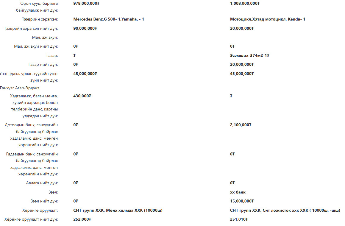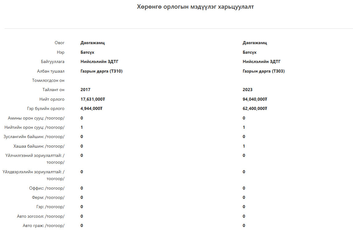 Тэгвэл түүний хөрөнгө, орлогын мэдүүлгийг нээлттэй мэдээллийн сангаас шүүж үзвэл 2017 онд өөрийн орлого 17 сая, гэр бүлийн орлого 4.9 сая төгрөг байсан бол 2023 онд түүний орлого 94 сая, гэр бүлийн орлого 64 сая төгрөг болж нэмэгдсэн буюу 5 дахин өссөн байна. Улмаар 2024 онд түүний өөрийн орлого 31 сая төгрөг болж, гэр бүлийн орлого 94 сая төгрөг болжээ. Мөн тэрбээр ХОМ-тээ нэг тэрбум төгрөгийн орон сууцтай, 45 сая төгрөгийн үнэт эдлэлтэй, 374м2 газартай гэж мэдүүлжээ.