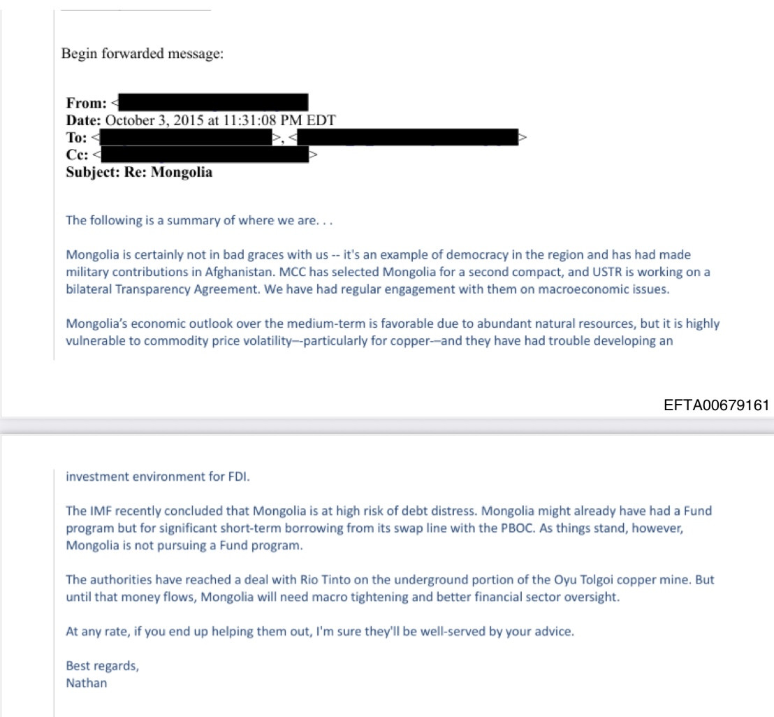 Жеффри Эпштейний хэрэгтэй холбоотойгоор АНУ-ын Хууль зүйн яамнаас олон нийтэд ил болгосон цахим шуудангуудын дунд Монгол Улсын эдийн засгийн бодлоготой холбоотой харилцаа, зөвлөлдөх шинжтэй агуулга багтсан нь анхаарал татаж байна. Үүнээс зарим агуулгуудыг түүвэрлэн хүргэе.