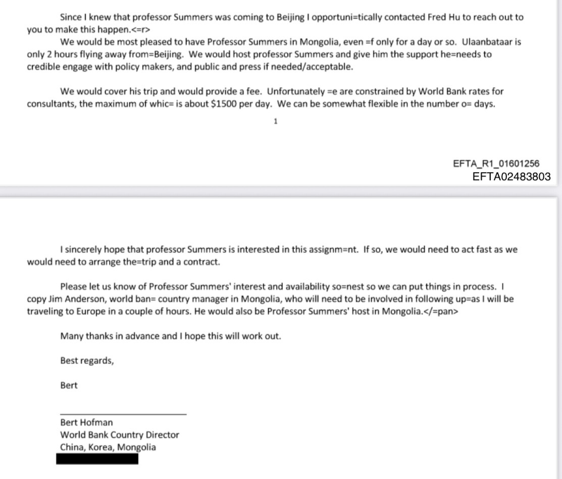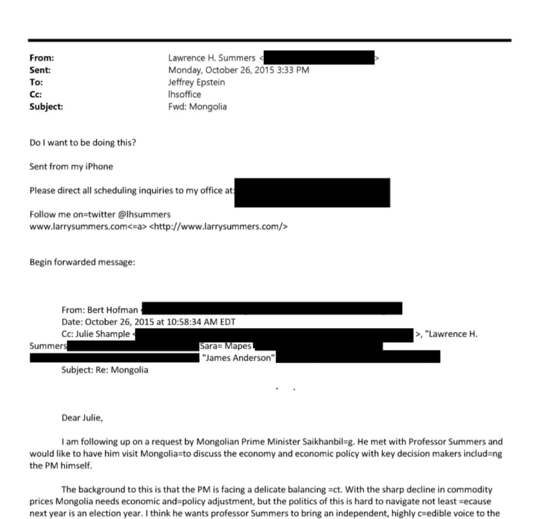 Тухайлбал, тухайн үеийн Ерөнхий сайд асан Ч.Сайханбилэг АНУ-ын Сангийн сайд асан, нөлөө бүхий эдийн засагч Лорэнс Саммерсыг Монгол Улсад урьж, эдийн засгийн бодлогын асуудлаар санал солилцох хүсэлт тавьсан тухай харилцаа эдгээр мэйлүүдэд дурдагджээ. Энэхүү уулзалтыг зохион байгуулах асуудлаар Дэлхийн банкны Хятад, Солонгос, Монголыг хариуцсан захирал асан Берт Хофман оролцож, Саммерсыг Монголд ирүүлэх боломжийг судалж байсан аж. Харин Лорэнс Саммерс уг урилгын талаар Жеффри Эпштейнтэй санал солилцох үед Эпштейн “Би лав уулзахгүй байсан. Дэлхийн банк яагаад оролцож байгааг ойлгохгүй байна. Ирээдүйн яриа хэлэлцээнд саад болно” хэмээн хариулсан байна.