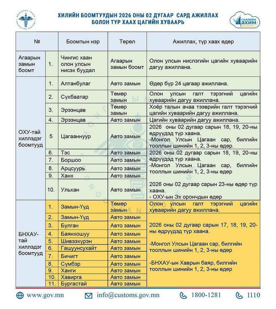 - БНХАУ-ын Хаврын баяр, билгийн тооллын шинийн 1,2,3-нд буюу 2026 оны хоёрдугаар сарын 17,18,19-ний өдөр тус тус Монгол, Хятадын хилийн боомтууд түр хаана.