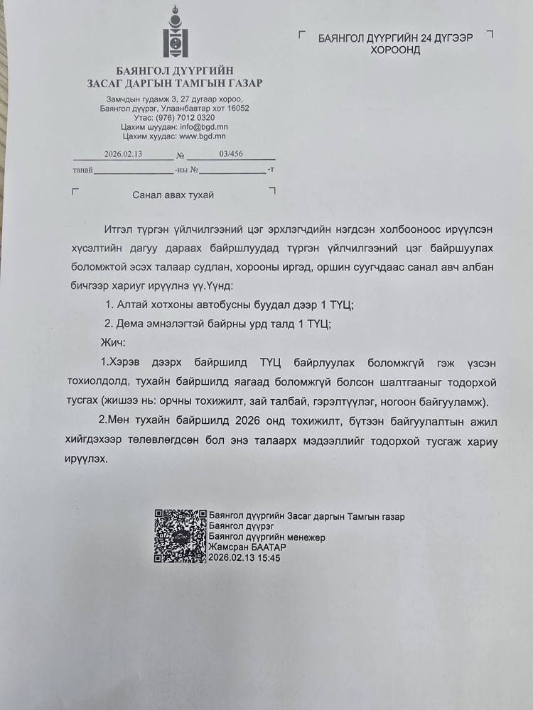 байршуулах боломжтой эсэхийг судалж, иргэдээс санал авч албан хариу ирүүлэхийг дурджээ. Мөн хэрэв боломжгүй гэж үзвэл шалтгааныг тодорхой тайлбарлах, 2026 онд тохижилт, бүтээн байгуулалтын ажил төлөвлөгдсөн эсэхийг тусгахыг чиглэл болгосон байна.