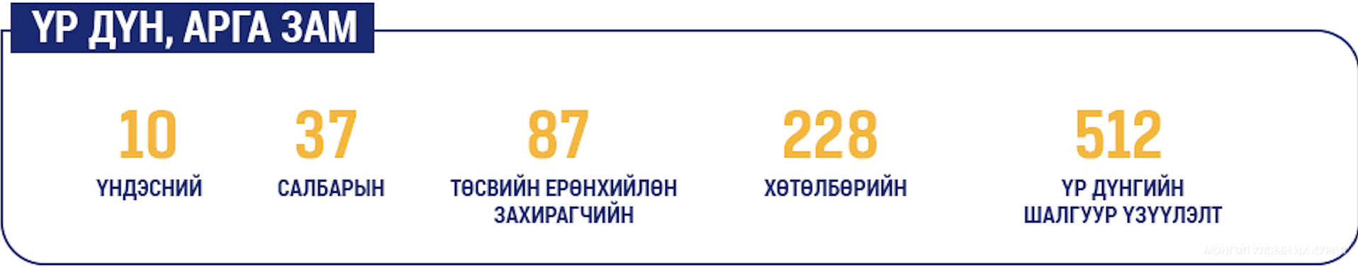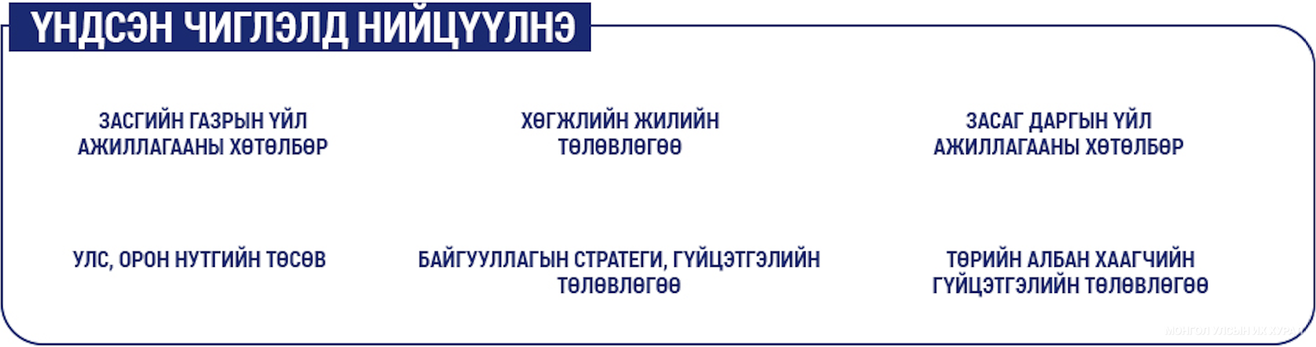 Таван жилийн үндсэн чиглэлийн хэрэгжилтийн үр нөлөөг үнэлэх, ахиц дэвшлийг хянах, үр дүнг үнэлэх, түүнд чиглүүлэх зорилгоор шалгуур үзүүлэлт, суурь болон зорилтот түвшнийг тогтоож өгчээ. Түүнчлэн Үндсэн чиглэлийг батлах тухай Улсын Их Хурлын тогтоолын хавсралтаар “Монгол Улсын 2026-2030 оны хөрөнгө оруулалтын хөтөлбөр”-ийг баталлаа. Тус хөтөлбөрт 30.0 тэрбум төгрөгөөс дээш өртөгтэй, техник, эдийн засгийн үндэслэл, зураг төсөл хийгдсэн, хөгжлийн урт болон дунд хугацааны бодлоготой нийцсэн төслүүдийг эрэмбэлж 70.1 их наяд төгрөгийн төсөвт өртөг бүхий 88 төслийг тусгасан.