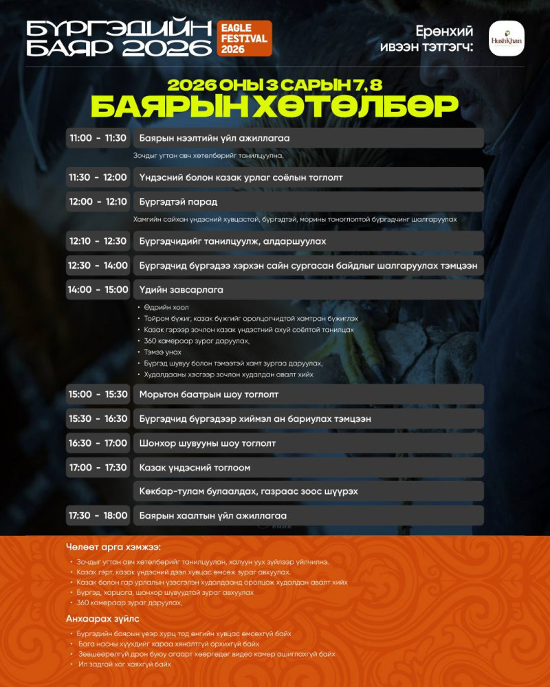 “Бүргэдийн баяр-2026” арга хэмжээг энэ жил өргөжүүлж, “Дэлхийн аварга шалгаруулах тэмцээн” болгож энэ сарын 7, 8-ны өдрүүдэд зохион байгуулах гэж байна.