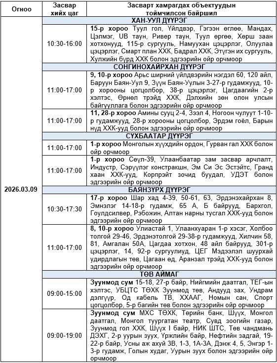 Маргааш буюу 2026 оны гуравдугаар сарын 9-ны Даваа гарагт цахилгаан шугам сүлжээнд хийх засварын хуваарийг танилцуулж байна.