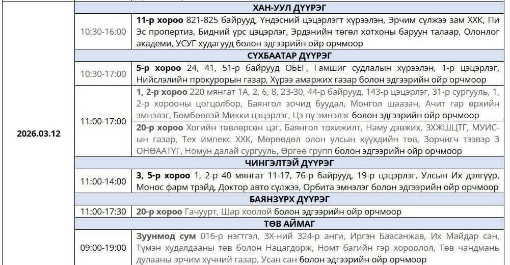 Цахилгаан шугам, тоног төхөөрөмжид төлөвлөгөөт засвар, үйлчилгээ хийхтэй холбоотойгоор 2026 оны гуравдугаар сарын 12-ний өдөр Улаанбаатар хотын зарим дүүрэг болон Төв аймагт цахилгааны түр хязгаарлалт хийхээр төлөвлөөд байна.