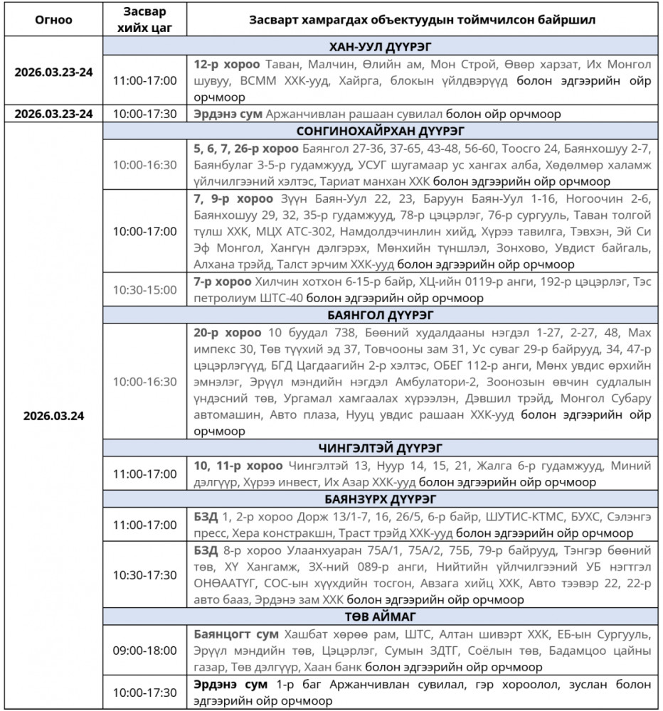 Хуваарийн дагуу өнөөдөр буюу 2026 оны гуравдугаар сарын 24-ний Мягмар гарагт цахилгаан шугам сүлжээнд хийх засварын хуваарийг танилцууллаа. Тодруулбал, Сонгинохайрхан, Баянгол, Чингэлтэй, Баянзүрх дүүрэг болон Төв аймагт цахилгаан хязгаарлах юм байна.
