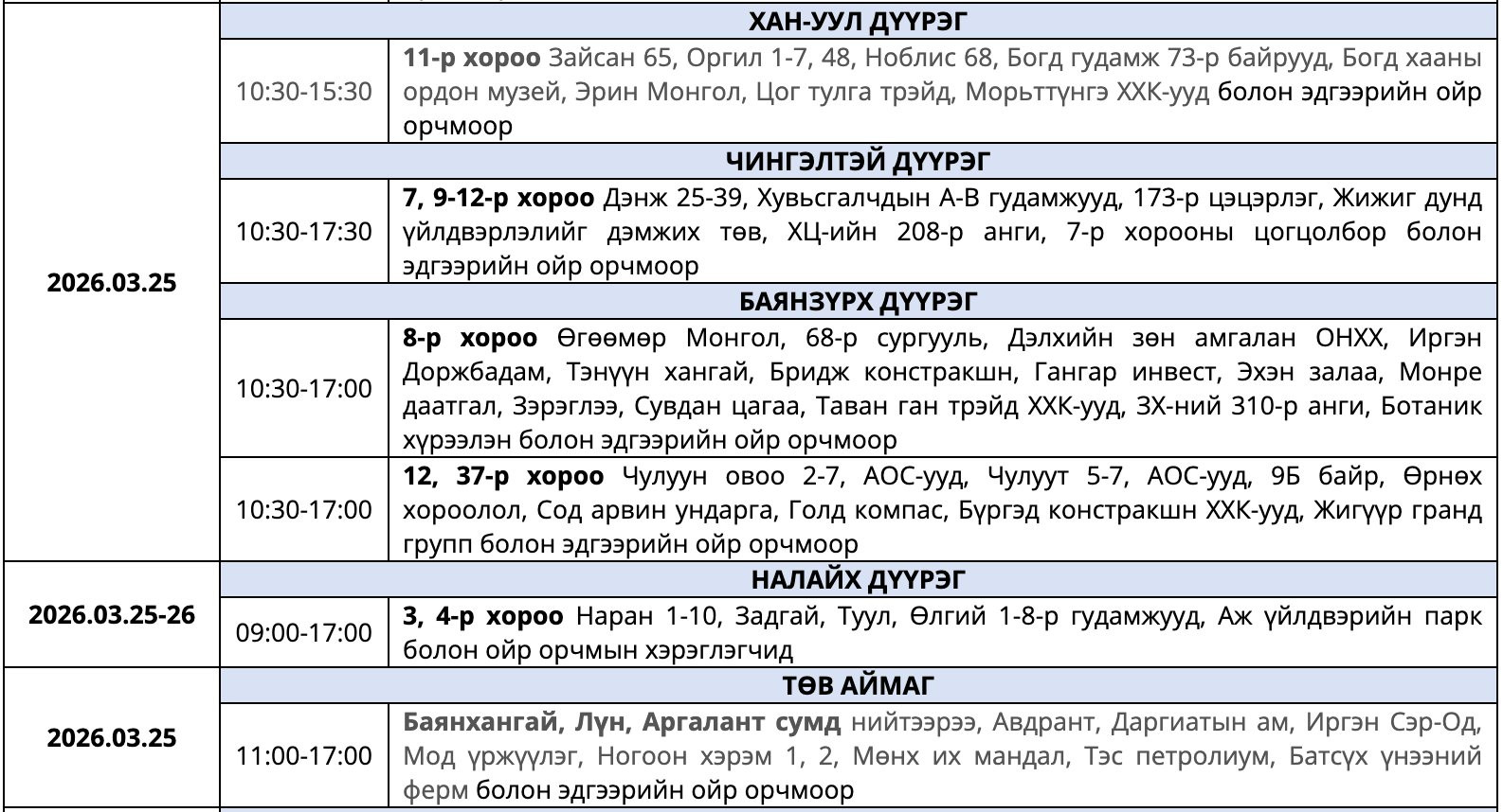 Өнөөдөр /2026.03.25/ дараах байршлуудад цахилгааны хязгаарлалт хийнэ. Үүнд, Хан-Уул дүүргийн 11-р хороо, Чингэлтэй дүүргийн 7, 9-12-р хороо, Баянзүрх дүүргийн 8, 12, 37-р хороо, Налайх дүүргийн 3, 4-р хороо, Төв аймгийн Баянхангай, Лүн, Аргалант сум.