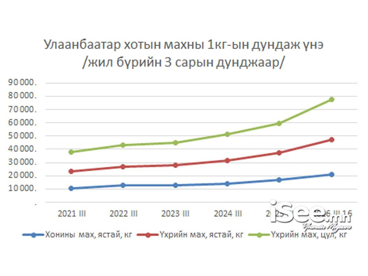 Үндэсний статистикийн хорооны мэдээлснээр энэ оны гуравдугаар сард үхрийн цул махны дундаж үнэ 30 мянга 179 төгрөг байна. Энэ өмнө жилийн гуравдугаар сартай харьцуулахад 7 мянга 647 төгрөгөөр нэмэгджээ. Харин хонины ястай мах дөрвөн мянга орчим төгрөгөөр нэмэгдэж, үхрийн ястай мах зургаан мянган төгрөгөөр нэмэгджээ.