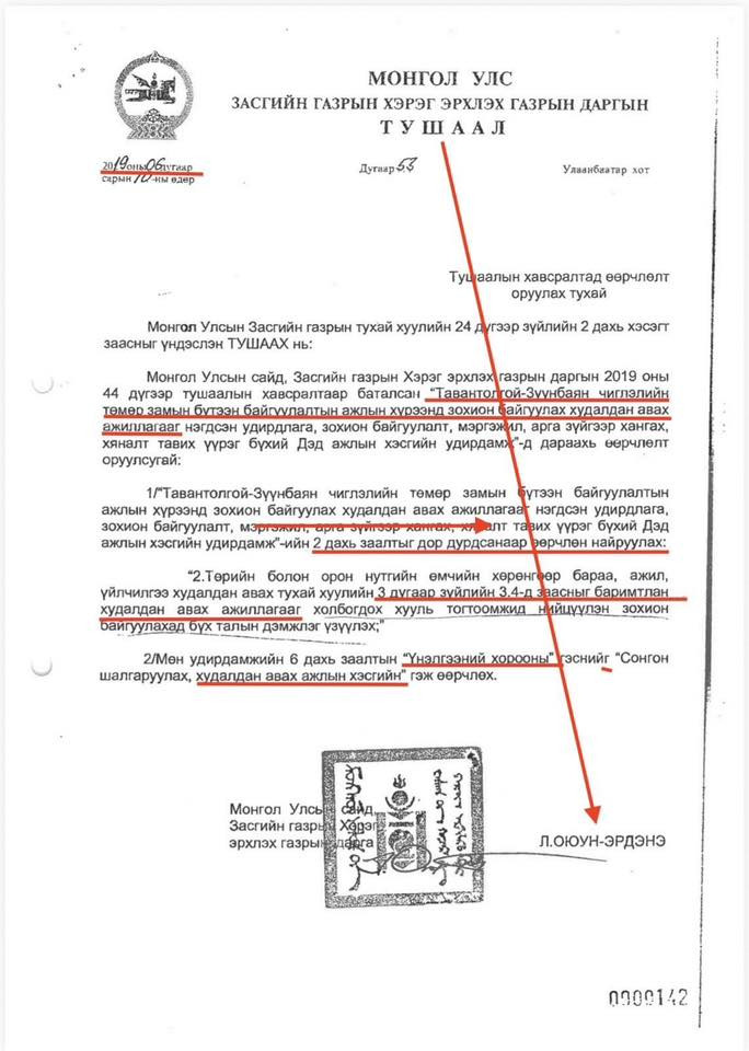 Харин Хууль зүй, дотоод хэргийн дэд сайд Д.Мөнх-Эрдэнэ УИХ-ын гишүүн Л.Оюун-Эрдэнэ Тавантолгой–Зүүнбаян чиглэлийн 416.6 км урт төмөр замын, ойролцоогоор 1.4 их наяд төгрөгийн өртөгтэй төслийн худалдан авах ажиллагааг сонгон шалгаруулалт явуулахгүйгээр “шууд гэрээ”-ний хэлбэрээр зохион байгуулсан гэх баримтыг танилцууллаа. Мөн уг төслийн нийт ажлын 88 хувийг аж ахуйн нэгжүүд гүйцэтгэсэн талаар мэдээлэв.