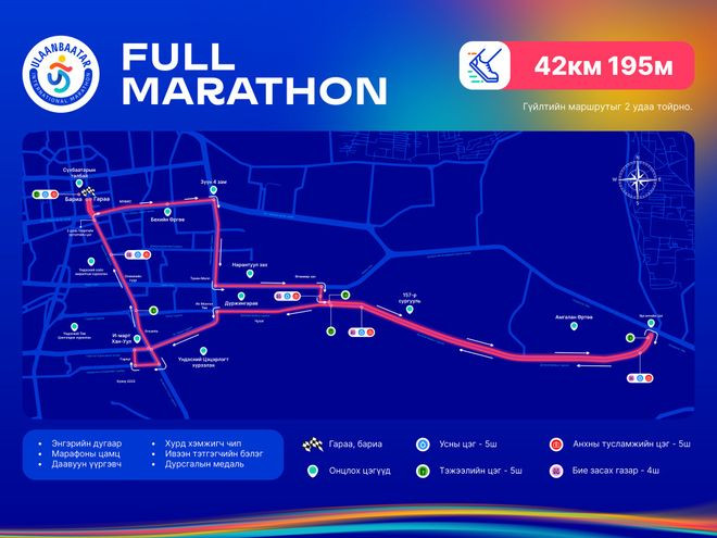 Нийслэлийн биеийн тамир, спортын газраас 42 км 195м болон 21 км 095м зайн гүйлтийн албан ёсны маршрутыг өчигдөр баталжээ. Энэ удаагийн замын хэмжилтэнд Азийн хөнгөн атлетикийн холбооны мэргэжилтэнд оролцсон байна. Уг маршрут нь тамирчдын гүйлтэд таатай байхаас гадна Улаанбаатар хотын төвийн гол гудамж, өргөн чөлөөг хамарснаараа онцлог болжээ. 21 км 095м зайд гүйх гүйгчид төв талбайгаас гараа хийж зүүн дөрвөн зам, “Нарантуул” худалдааны төв, Амгалан өртөөгөөр эргэн Үндэсний цэцэрлэгт хүрээлэнгээр дамжин барианд орно. Энэ зам нь өнгөрсөн жилийн замтай адил гэдгийг зохион байгуулагчид онцоллоо.
