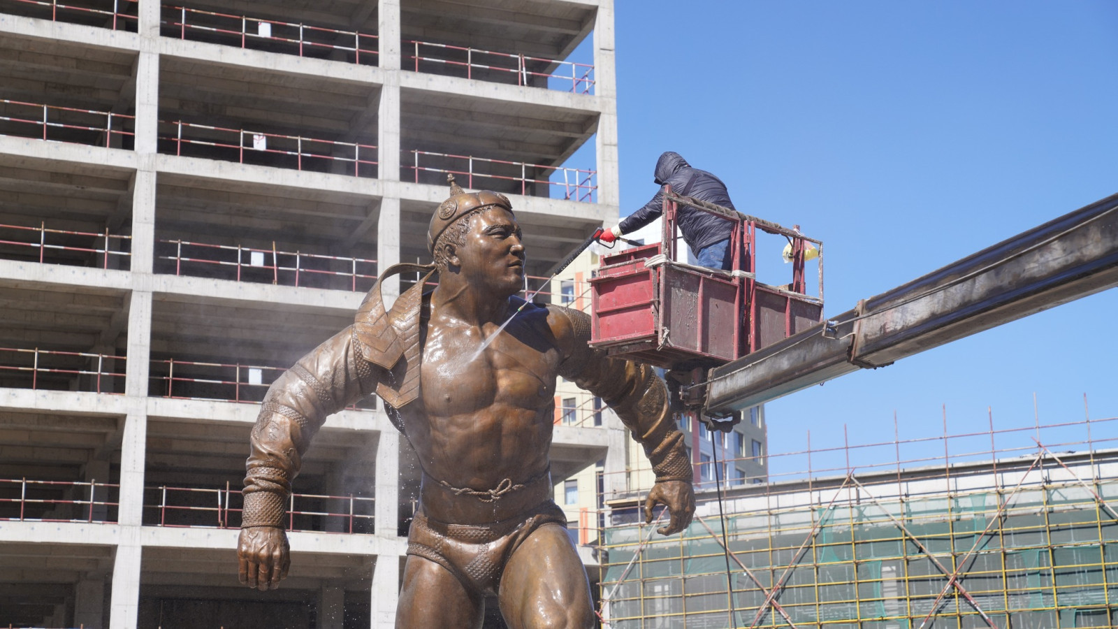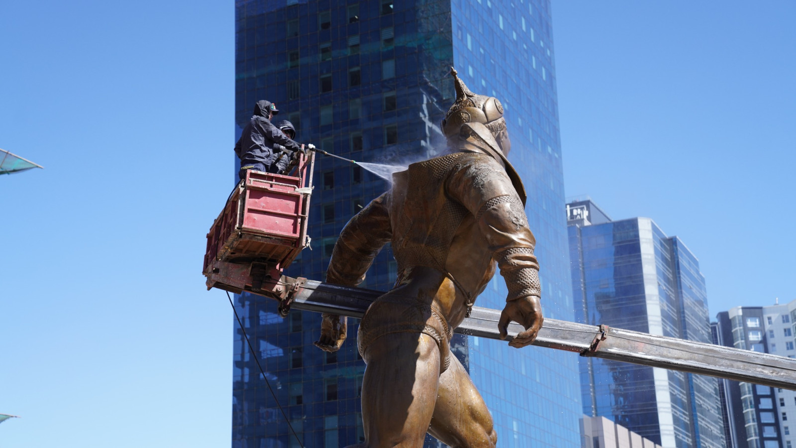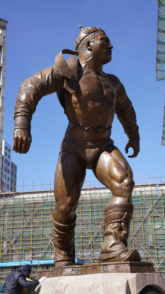 Төв цэнгэлдэх хүрээлэнд сүндэрлэн буй Дархан аварга Жигжидийн Мөнхбат агсны хүрэл хөшөөг өнөөдөр угаан цэвэрлэж, өнгө төрхийг нь сэргээлээ.