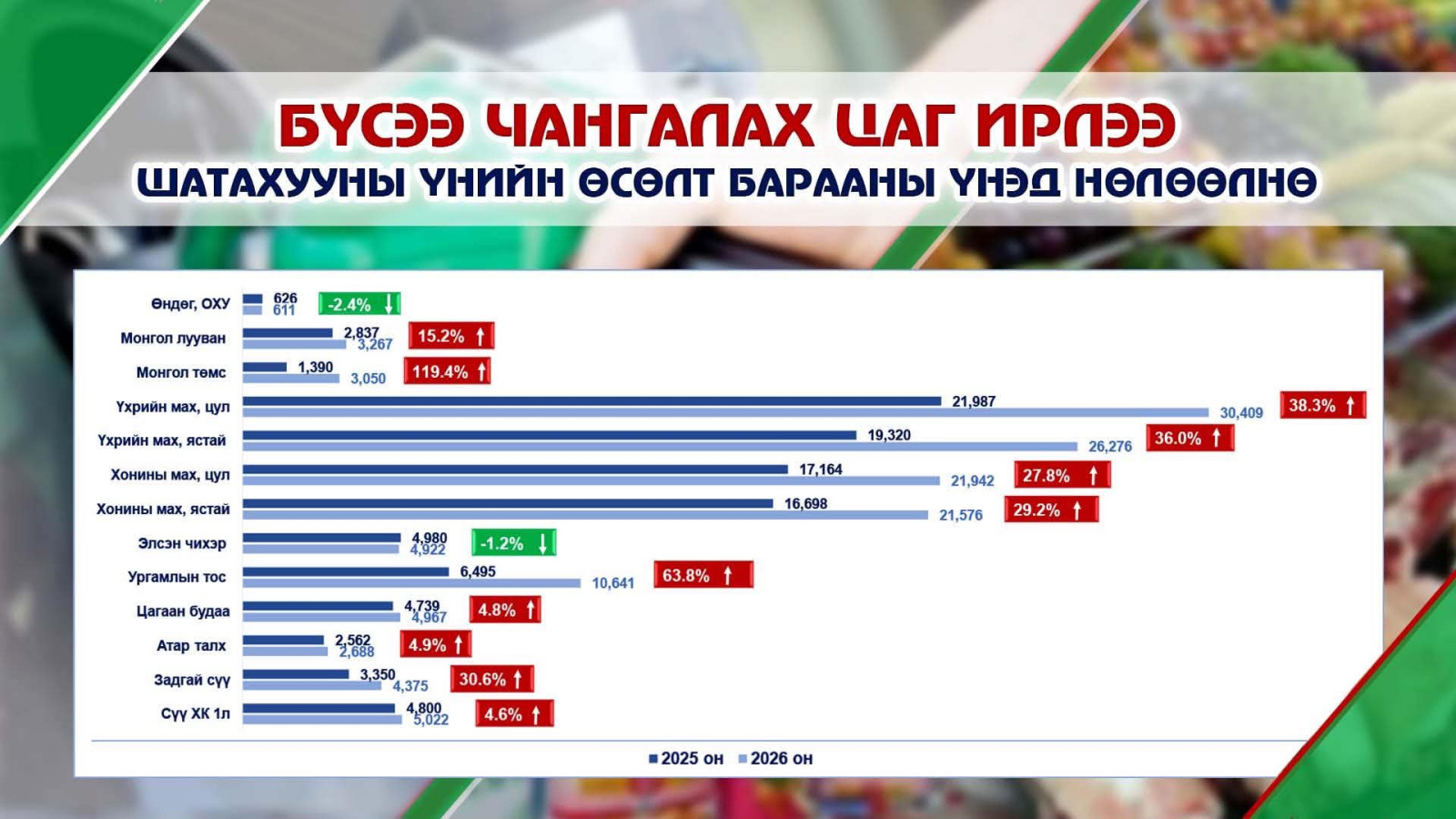 Нийслэлийн статистикийн газраас гаргасан мэдээллээр нийслэлийн төвийн 6 дүүрэгт байрладаг 15 хүнсний зах, худалдааны төвд хийсэн 33 төрлийн хүнсний бараа бүтээгдэхүүний үнэ өмнөх оны мөн үетэй харьцуулахад өссөн үзүүлэлттэй байна.