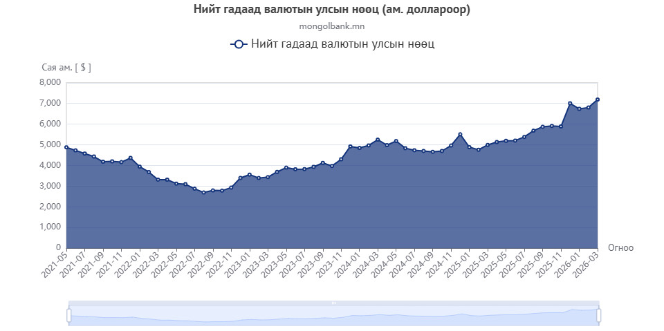 Монгол Улсын гадаад валютын нөөцийн хэмжээ 2026 оны нэгдүгээр улирлын эцсийн гүйцэтгэлээр 7,187.8 сая ам.долларт хүрч оны эхнээс 182.5 сая ам.доллароор өсөж, түүхэн дээд түвшинд хүрлээ.