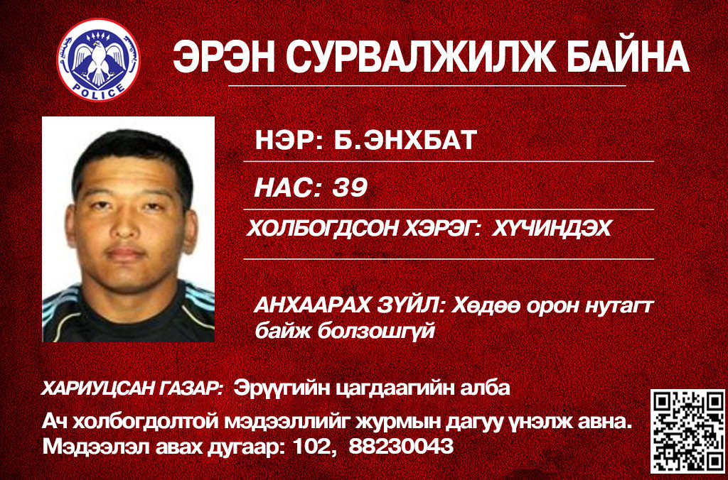 Тодруулбал, хүчингийн гэмт хэрэг үйлдсэн байж болзошгүй хэргээр шалгагдаж байгаа Б.Энхбат гэх 39 настай эрэгтэйг Эрүүгийн цагдаагийн албанаас эрэн сурвалжилж байгаа аж. Тухай этгээд нь хөдөө орон нутаг байж болзошгүй бөгөөд энэ хүний талаарх мэдээллийг журмын дагуу үнэлж авна гэдгийг тодотгосон байна.