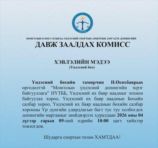 Харин Н.Өсөхбаяр Үндэсний спортын арбитрт гомдол гаргасан байдаг. Иймд Монголын олон улсын ба Үндсэний спортын арбитрын дэргэдэх допингийн давж заалдах комисс Н.Өсөхбаярын өргөдөлд допингийн давж заалдах журмаар маргаан шийдвэрлэх ажиллагааг үүсгэсэн. Тэгвэл Үндэсний бөхийн тамирчин Н.Өсөхбаярын өргөдөлтэй “Монголын үндэсний допингийн эсрэг байгууллага” НҮТББ, Үндэсний их баяр наадмыг зохион байгуулах хороо, Үндэсний их баяр наадмын Бөхийн салбар хороо, Үндэсний их баяр наадмын бөхийн салбар хорооны Үр дүнгийн удирдлагын багт тус тус холбогдох допингийн маргааныг шийдвэрлэх хуралдаан маргааш /2026.04.08/ 10:00 цагт хийхээр товлогдсон.
