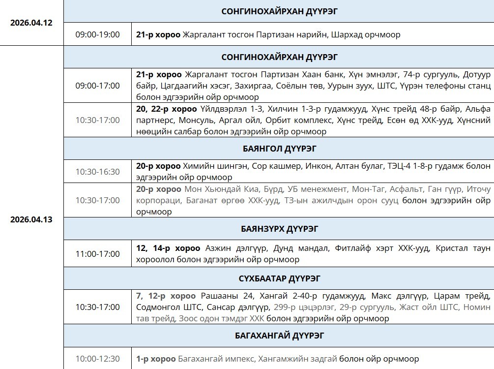 Улаанбаатар Цахилгаан Түгээх Сүлжээ ТӨХК 2026 оны дөрөвдүгээр сард цахилгаан шугам тоноглолд засвар хийх тоймчилсон байршил, цагийн хуваарийг мэдээлсэн.