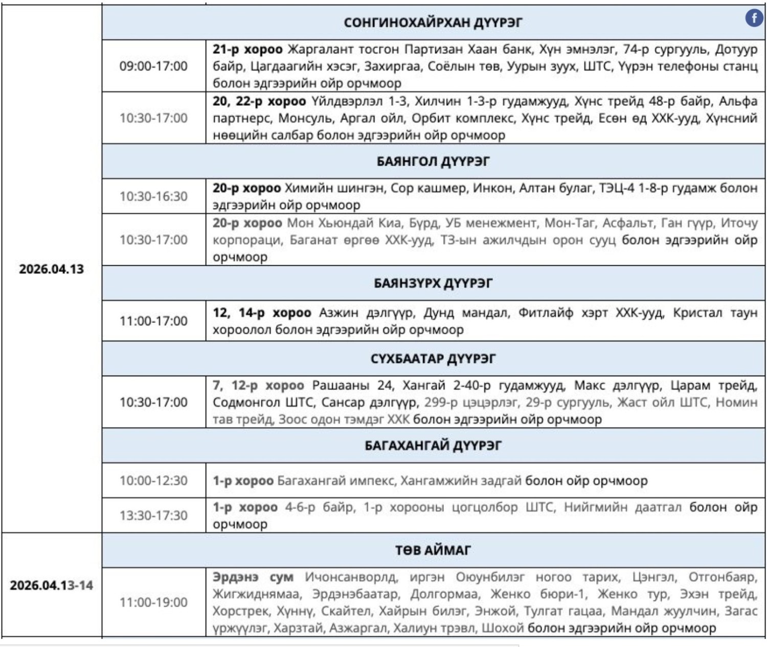 Улаанбаатар Цахилгаан Түгээх Сүлжээ ТӨХК 2026 оны дөрөвдүгээр сард цахилгаан шугам тоноглолд засвар хийх тоймчилсон байршил, цагийн хуваарийг мэдээлсэн.