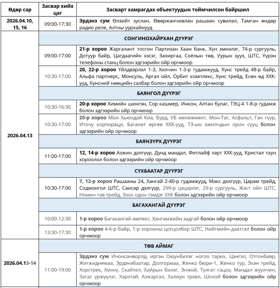 Улаанбаатар цахилгаан түгээх сүлжээ ТӨХК-аас өнөөдөр /2026.04.13/ цахилгааны шугам сүлжээнд хийх засварын хуваарийг танилцууллаа.