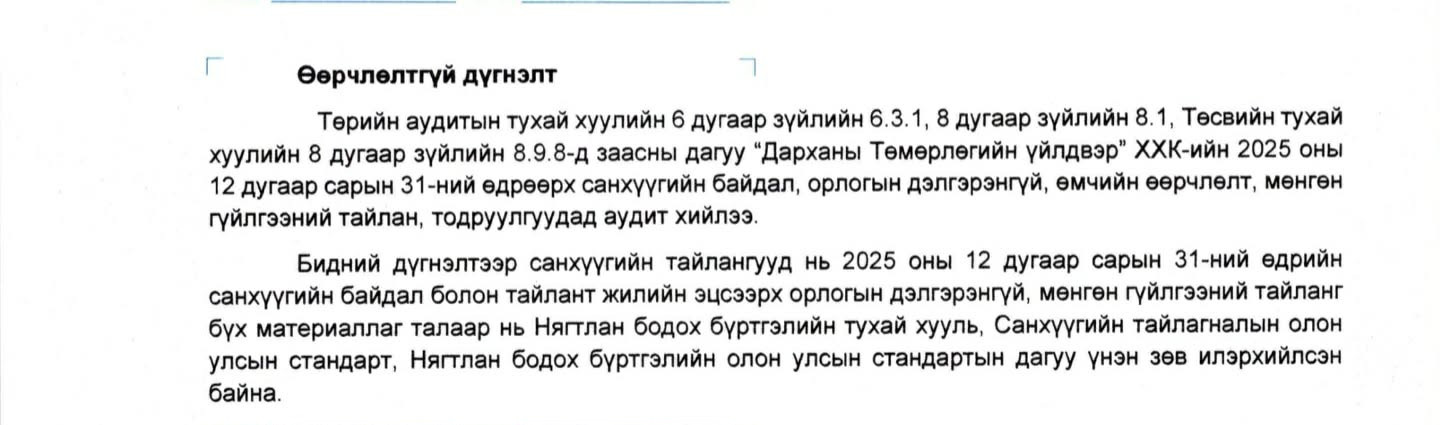 Үндэсний аудитын газраас төрийн өмчит аж ахуйн нэгжүүдийн 2025 оны санхүүгийн тайланд хийсэн аудитын нэгдсэн дүнг танилцууллаа. Аудитын дүгнэлтээр нийт 8.3 их наяд төгрөгийн зөрчил илэрсэн байна. Харин энэ удаагийн аудитын дүнгээр “Дарханы төмөрлөгийн үйлдвэр” компани зөрчилгүй буюу өөрчлөлтгүй дүгнэлт авсан цөөн компанийн нэгээр тодорчээ.