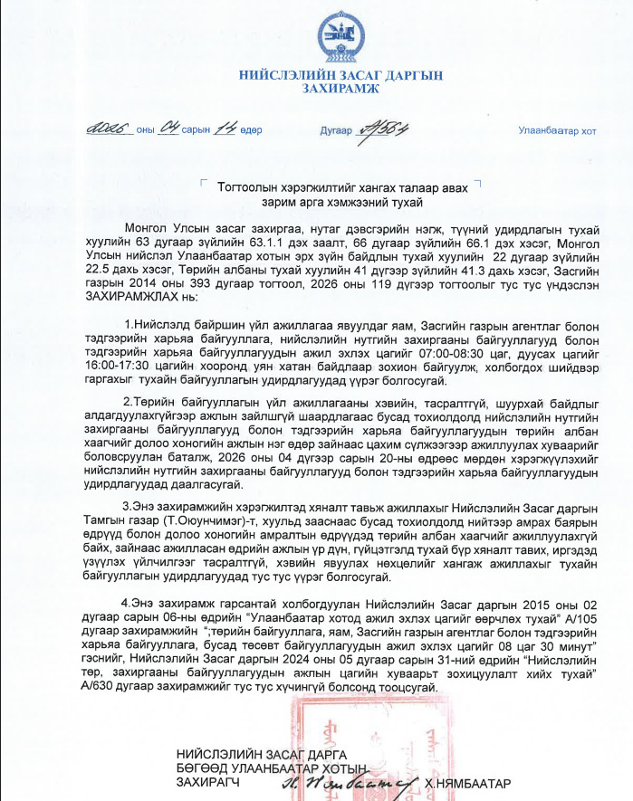 Энэ хүрээнд нийслэлийн Засаг даргын А/564 тоот захирамжаар нийслэлд байршин үйл ажиллагаа явуулдаг яам, Засгийн газрын агентлаг, тэдгээрийн харьяа байгууллага, нийслэлийн нутгийн захиргааны байгууллагууд болон тэдгээрийн харьяа байгууллагуудын ажил эхлэх цагийг 07:00-08:30, дуусах цагийг 16:00-17:30 цагийн хооронд уян хатан байхаар шийдвэрлэлээ. Мөн төрийн байгууллагын үйл ажиллагааны хэвийн, тасралтгүй, шуурхай байдлыг алдагдуулахгүйгээр ажлын зайлшгүй шаардлагаас бусад тохиолдолд нийслэлийн төр, захиргааны байгууллагын албан хаагчид 2026 оны 4 дүгээр сарын 20-ны өдрөөс долоо хоногийн нэг өдөр зайнаас цахимаар ажиллана.