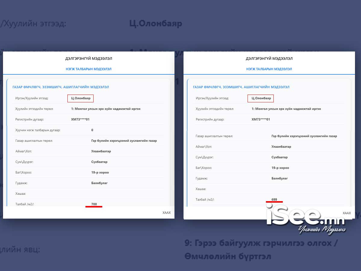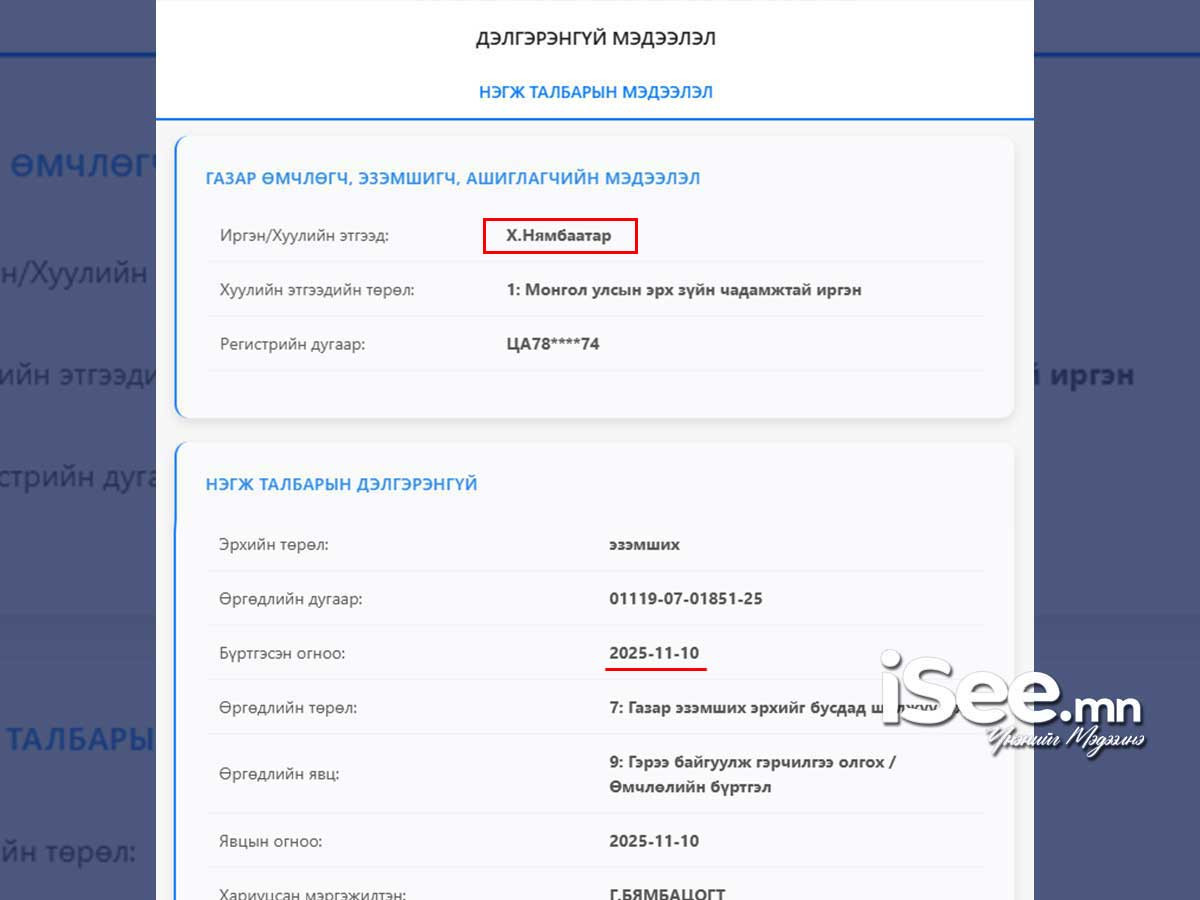 Хотын дарга Х.Нямбаатар тухайн газрыг эзэмших эрхийг бусдаас шилжүүлж авсан байж магадгүй бөгөөд газар эзэмших гэрээг өнгөрсөн жил буюу 2025 оны арваннэгдүгээр сарын 10-ны өдөр хийж, 15 жилийн хугацаатайгаар эзэмших болжээ. Тэрбээр тухайн газартаа граж бүхий тансаг зэрэглэлийн хоёр давхар байшин барьсан байна.