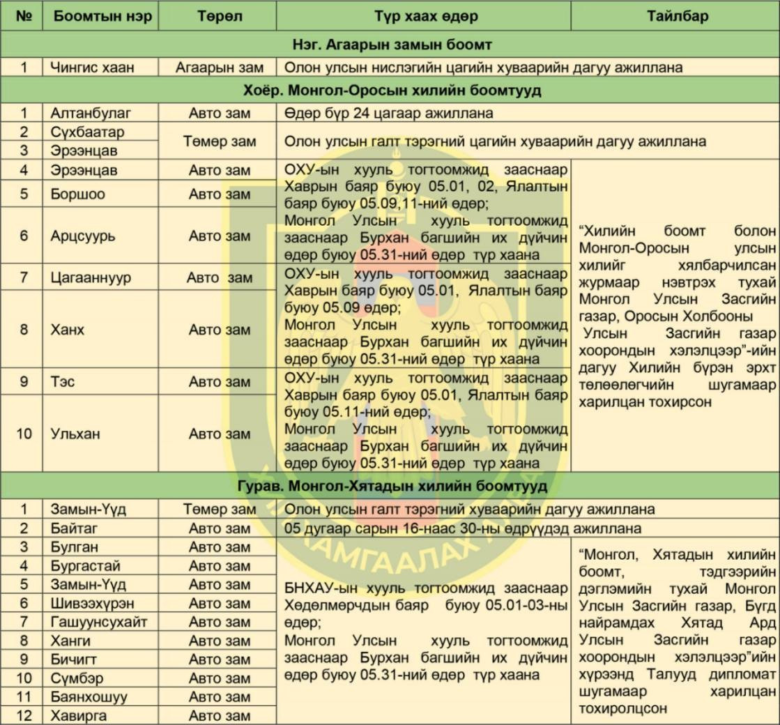 Тухайлбал, Орос-ын хаврын баяр тавдугаар сарын 1, 2-нд, мөн Ялалтын баяр тавдугаар сарын 9, 11-нд тохиож буйтай холбоотойгоор Монгол-Оросын хилийн зарим боомтыг түр хугацаанд хаахаар болжээ. Үүнээс гадна Бурхан багшийн их дүйчин өдөр буюу тавдугаар сарын 31-нд бүх хилийн боомт ажиллахгүй юм байна. Харин Монгол-БНХАУ-ын хилийн боомтуудын хувьд Хөдөлмөрчдийн баяр тавдугаар сарын 1-3-нд тохиож буйтай холбогдуулан тухайн өдрүүдэд мөн түр хаахаар зохицуулалт хийжээ. Иймд иргэд, аж ахуйн нэгжүүд дээрх өдрүүдэд хилээр зорчих, тээвэр ложистикийн үйл ажиллагаагаа урьдчилан төлөвлөхийг холбогдох байгууллагууд анхаарууллаа.