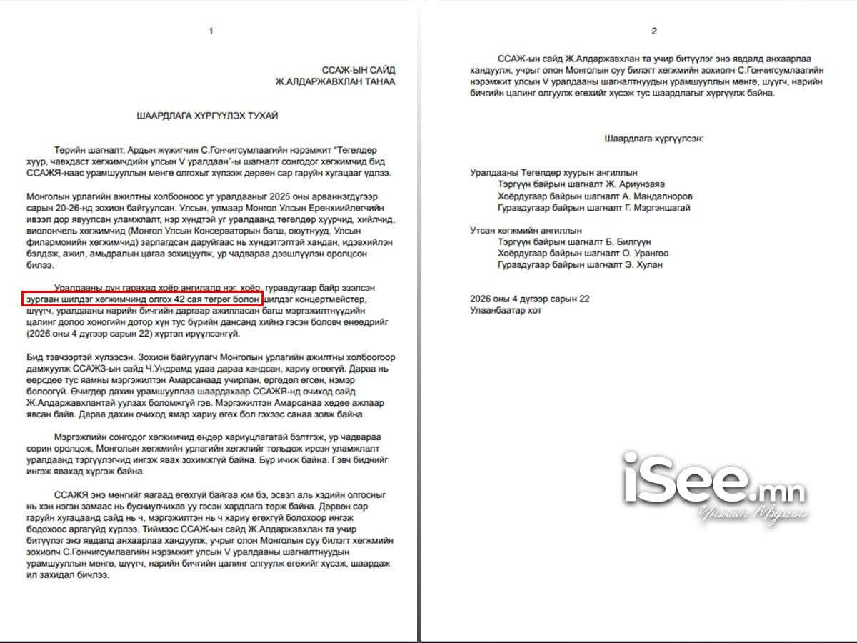 Тиймээс Уралдааны Төгөлдөр хуурын ангиллын Тэргүүн байрын шагналт Ж.Ариунзаяа, Хоёрдугаар байрын шагналт А.Мандалноров, Гуравдугаар байрын шагналт Г.Мэргэншагай, Утсан хөгжмийн ангиллын Тэргүүн байрын шагналт Б.Билгүүн, Хоёрдугаар байрын шагналт О.Урангоо, Гуравдугаар байрын шагналт Э.Хулан нар /2026.04.22/-нд одоогийн ССАЖ-ЫН САЙД Ж.Алдаржавхланд дахин шаардлага хүргүүлжээ.