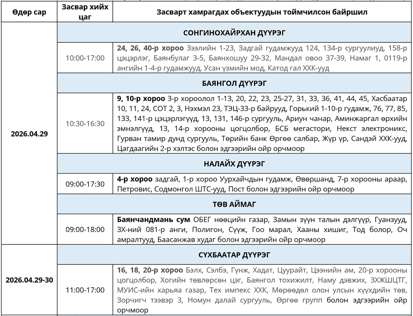 Хуваарийн дагуу өнөөдөр /2026.04.29/ нийслэлийн дөрвөн дүүрэгт цахилгаан хязгаарлана. Тухайлбал, Сонгинохайрхан, Баянгол дүүрэг, Налайх дүүрэг болон Төв аймгийн Баянчандмань суманд 09:00-18:00 цагийн хороонд, Сүхбаатар дүүрэгт өнөөдөр, маргааш 11:00-17:00 цагийн хооронд хязгаарлана.