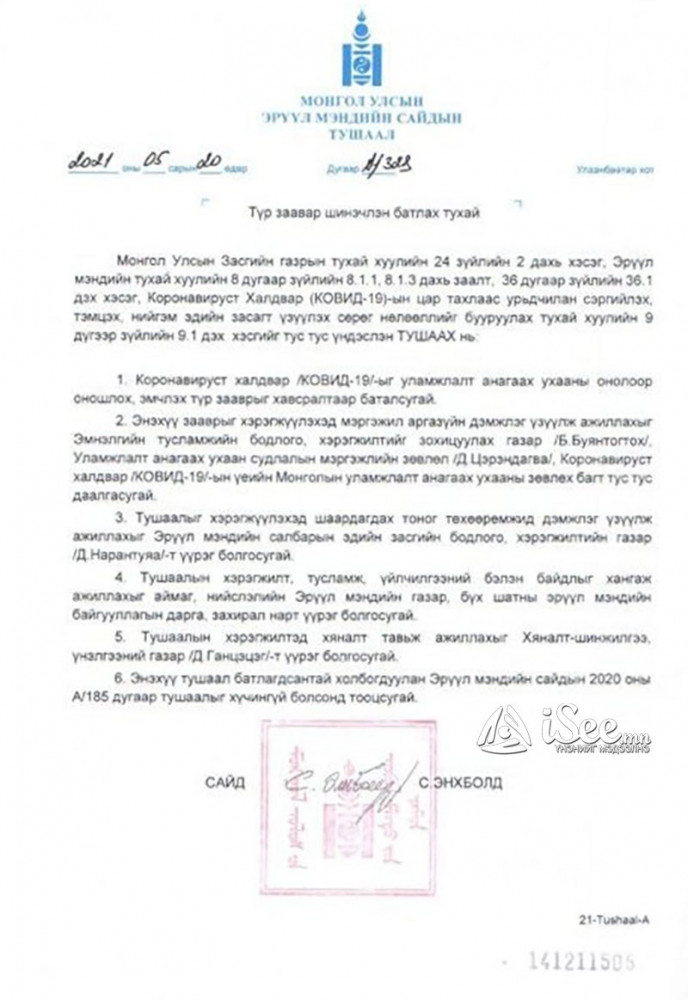 Тэгвэл Эрүүл мэндийн сайд С.Энхболд өнгөрөгч тавдугаар сарын 20-ны өдөр “Түр заавар шинэчлэн батлах тухай” А/328 тоот тушаал гаргасан байна. Ингээд тус тушаалдаа “коронавируст халдварыг уламжлалт анагаах ухааны онолоор оношлох, эмчлэх түр зааврыг хавсралтаар баталсугай” хэмээгээд, холбогдох хүмүүст үүрэг даалгавар өгсөн байна.