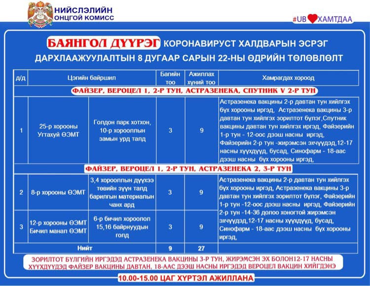 Өнөөдөр /2021.08.22/ Улаанбаатар хотод явуулын хоёр, суурин 40 цэгт 50 багийн 344 эмч, ажилтан ажиллаж, 5118 иргэнийг дархлаажуулахаар төлөвлөжээ. Харин дархлаажуулалтын цэгүүд 10.00-15.00 цаг хүртэл ажиллана. Дархлаажуулалтын цэгийг дүүрэг тус бүрээр танилцуулж байна.
