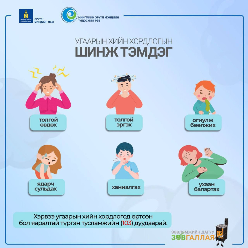 Өчигдөр буюу есдүгээр сарын 24-нд угаарын хийн хордлогын улмаас нэг өрхийн хоёр иргэн амиа алдсан бөгөөд 38 хүн эмнэлгийн тусламж, үйлчилгээ авсан байна. Байршлаар нь авч үзвэл Сонгинохайрхан, Чингэлтэй, Баянзүрх, Сүхбаатар, Хан-Уул дүүрэгт нийт 15 өрхийн 38 иргэн угаарын хийн хордлогод өртөж эмнэлгийн тусламж, үйлчилгээ авчээ. Түлш бүрэн шатаж байхад яндангаа авахгүй, өрхөө бүтээхгүй байхыг тус төвөөс зөвлөлөө.