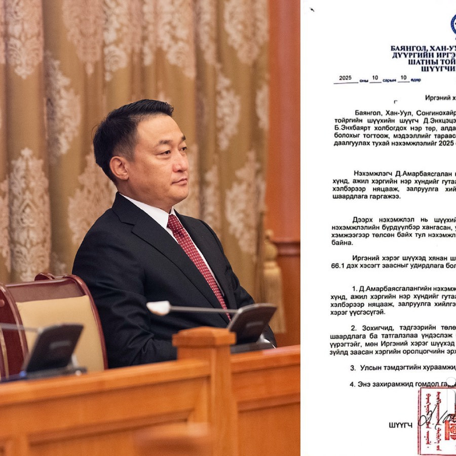 Иймд Засгийн газрын үйл ажиллагааны тасралтгүй, шуурхай байдлыг хангах үүднээс Засгийн газрын гишүүн, Хууль зүй, дотоод хэргийн сайдыг томилох асуудлыг 2025 оны аравдугаар сарын 02-ны өдөр Улсын Их Хуралд танилцуулж, Монгол Улсын Үндсэн хуулийн Гучин есдүгээр зүйлийн 4 дэх хэсэгт заасан бүрэн эрхээ хэрэгжүүлэх нөхцөлийг бүрдүүлэхийг Ерөнхий сайд Г.Занданшатар албан бичигтээ хүссэн байна.
