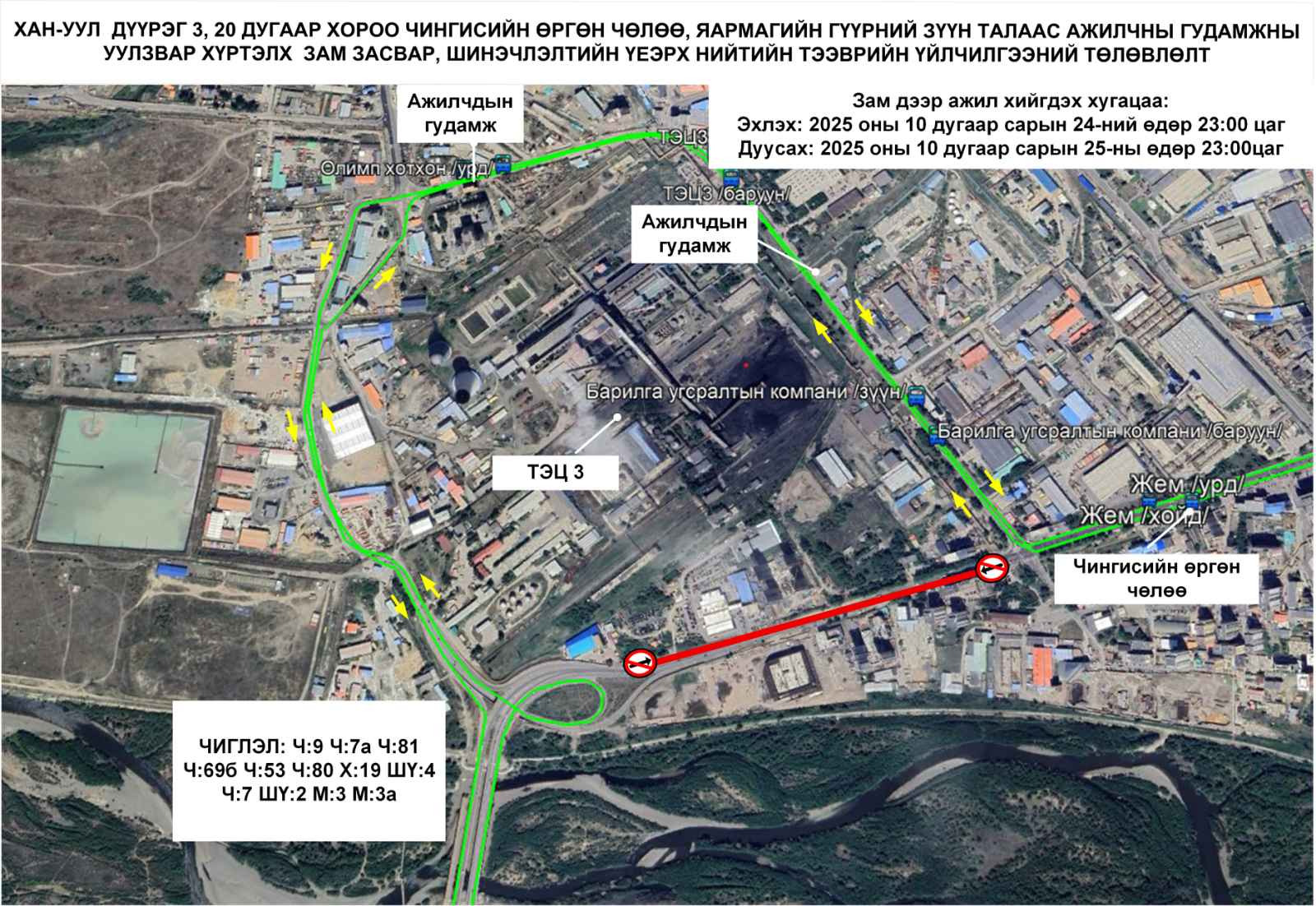 Хан-Уул дүүргийн 3, 20 дугаар хороо Чингисийн өргөн чөлөө, Яармагийн гүүрний зүүн талаас Ажилчны гудамжны уулзвар хүртэлх зам, засвар, шинэчлэлтийн ажил энэ сарын 24-ны өдөр 23:00 цагаас эхэлнэ.