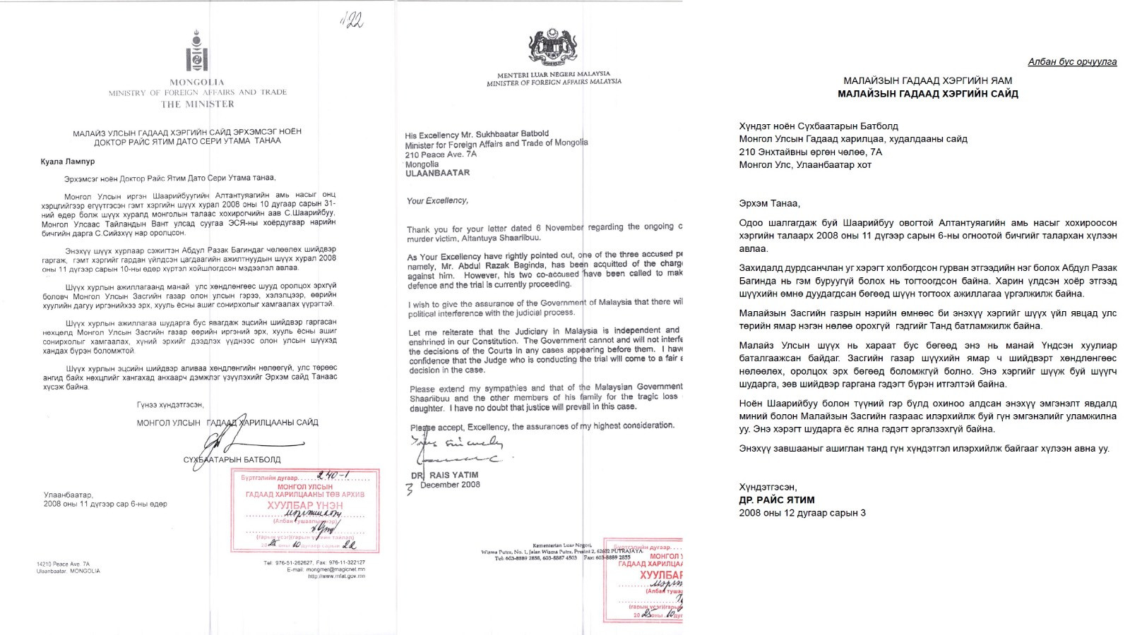 Хожим нь 2008 онд С.Батболд Гадаад харилцааны сайдаар томилогдсоныхоо дараа уг хэрэгт онцгой анхаарал хандуулан, хэргийг хоёр орны харилцаанд нөлөөлөхүйц хэмжээнд хүртэл хүчин чармайлт гарган ажилласан. Уг жигшүүрт хэргийг шийдвэрлэх үйл явцад ямар нэгэн улс төрийн нөлөө оруулахгүй байх, гэмт этгээдүүдэд хууль ёсны шийтгэлийг нь оногдуулахыг шаардсан захидлыг Малайзын Гадаад хэргийн сайд доктор Райс Ятим Дато Сери Утамд хүргүүлж, мөн ондоо багтаан Малайзын талаас албан ёсны хариу авч ажилласан. Малайзад явагдаж буй шүүх хурлын явцыг байнга ажиглаж, тус улсад Гадаад харилцааны яамнаас тусгай элч томилох ажлыг зохион байгуулж, мухардалд ороод байсан хэргийг мөрдөх, шүүх ажиллагааг дахин эхлүүлэхэд онцгой үүрэг гүйцэтгэснийг гэрчлэх олон хүн, архивын материалууд бий.