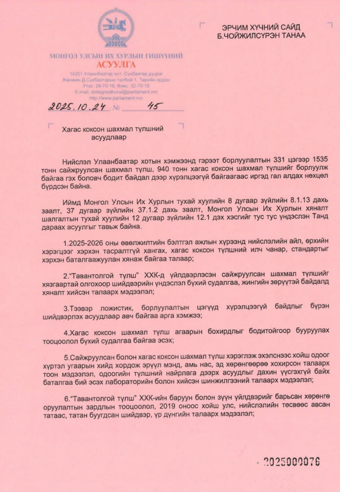 Хагас коксон шахмал түлшний асуудлаар УИХ-ын гишүүн Ц.Баатархүү Эрчим хүчний сайд Б.Чойжилсүрэнд асуулга тавьжээ.