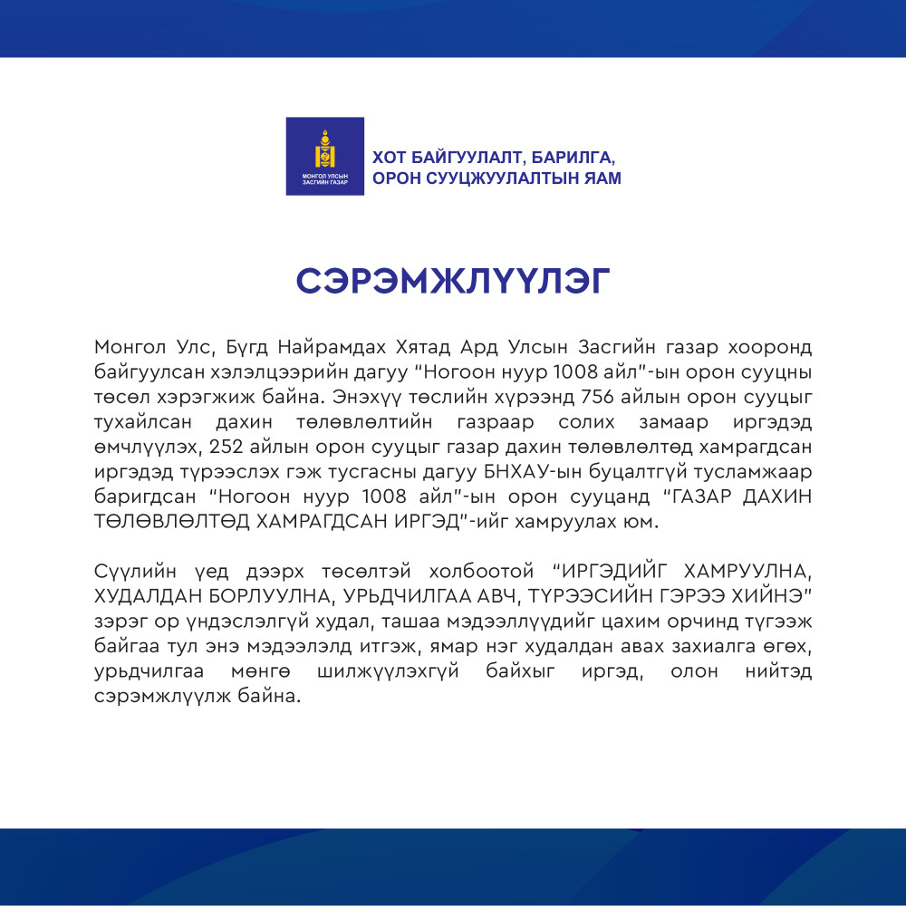 “Ногоон нуур 1008 айл”-ын орон сууцанд иргэдийг хамруулна, худалдан борлуулна, урьдчилгаа авч түрээсийн гэрээ хийнэ зэрэг ор үндэслэлгүй, худал, ташаа мэдээллүүдийг цахим орчинд түгээж байгаа талаар Хот байгуулалт, барилга орон сууцжуулалтын яамнаас мэдээлжээ. Иймд, Иймд энэ төрлийн мэдээлэлд итгэж, ямар нэгэн худалдан авах захиалга өгөх, урьдчилгаа мөнгө шилжүүлэхгүй байхыг иргэд, олон нийтэд сэрэмжлүүлж байна.