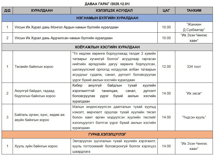 Өнөөдөр /2025.12.01/ УИХ дахь намын бүлгүүд хуралдаж энэ долоо хоногт байнгын хороо, чуулганы хуралдаанаар хэлэлцэх асуудлаар байр сууриа нэгтгэнэ.