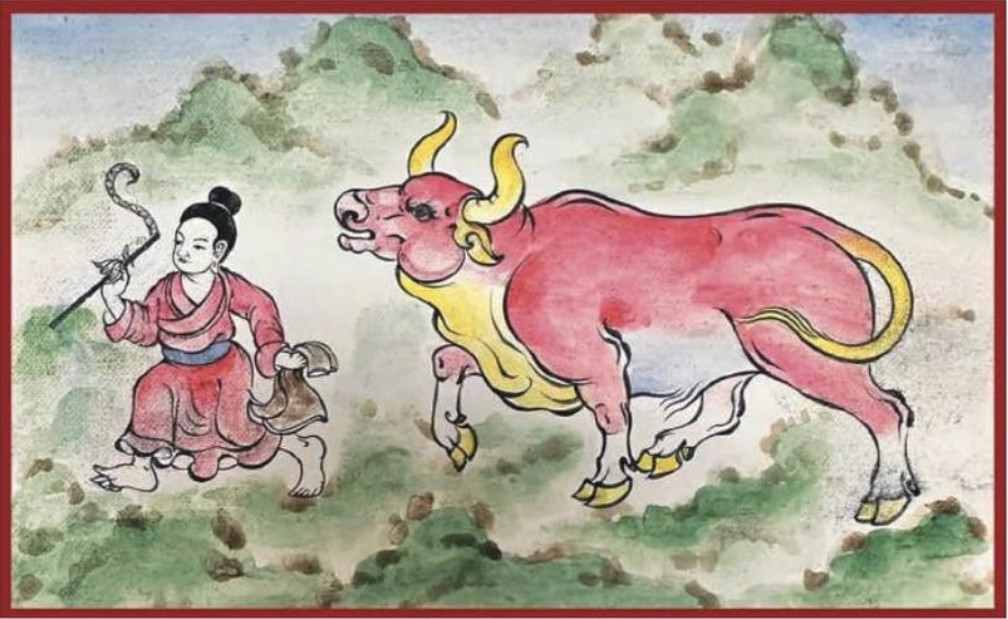 Үхэр хариулаач нь: Улаан дээлтэй, цагаан царайтай, хөх бүстэй, толгой дээрээ үсээ овоолж боогоод хоёр гутлаа барьсан идэр залуу хүн үхрийнхээ өмнө унган шивлүүр барин яаран гүйж явна.