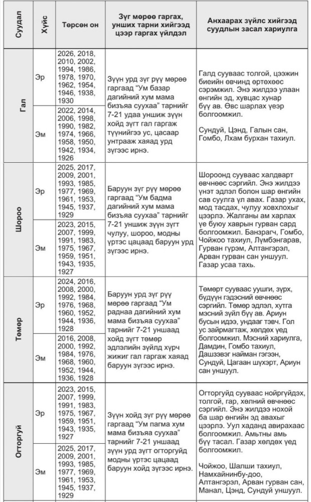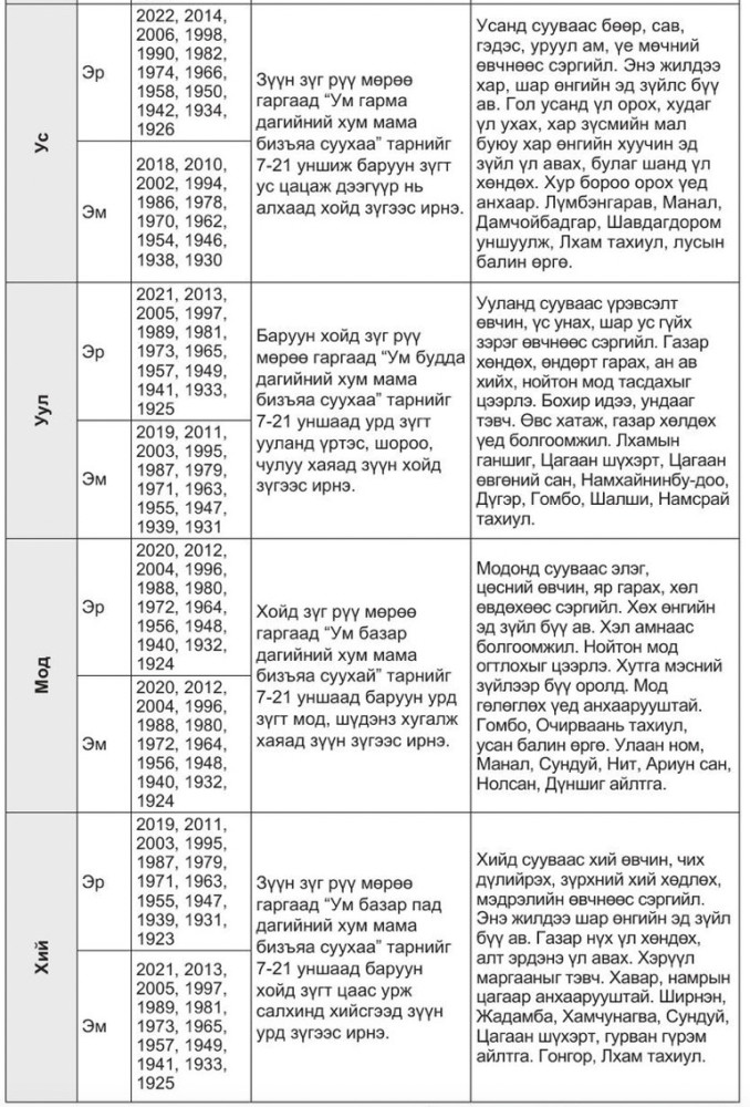 Зурхайн ухаанд “Үхэр шар, амаа ангайн, сүүлээ эртэдээ хүчтэй аадар мөндөр болон үхэр хариулаач” хоёрын зургийг махбодын зурхаар гарган тооцоолж, тухайн жилийн мал сүрэг хийгээд хүн зоны төлөв байдал тэргүүтэй маш олон зүйлийг урьдчилан хий мэдэх арга байдаг. Тэр зурлагаар жилийн төлөв байдлыг гаргавал: