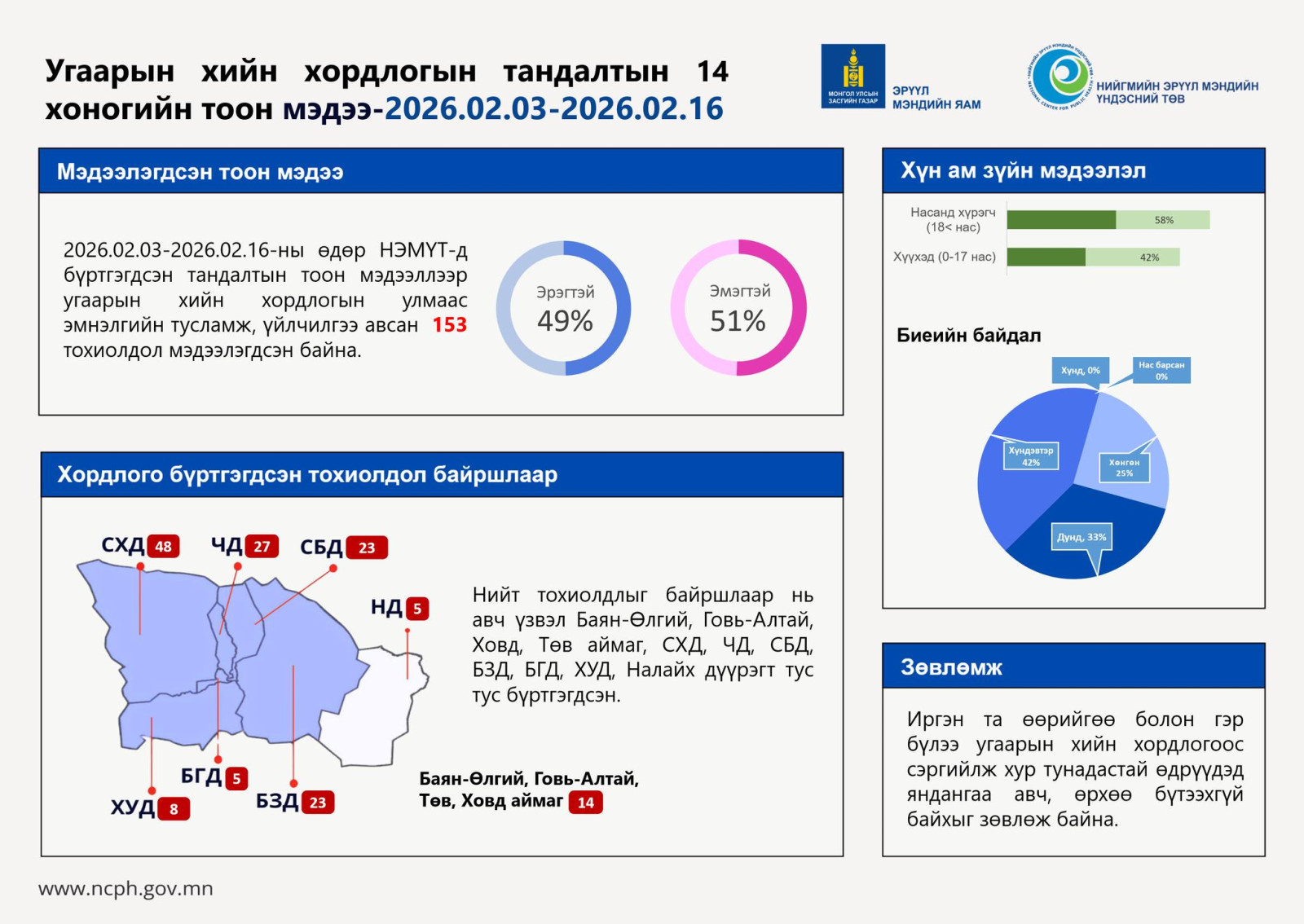 Өнгөрсөн 14 хоногийн хугацаанд хоёрдугаар сарын 3-16-ны хооронд 153 иргэн угаарын хийд хордож, эмнэлгийн тусламж үйлчилгээ авсан байна.