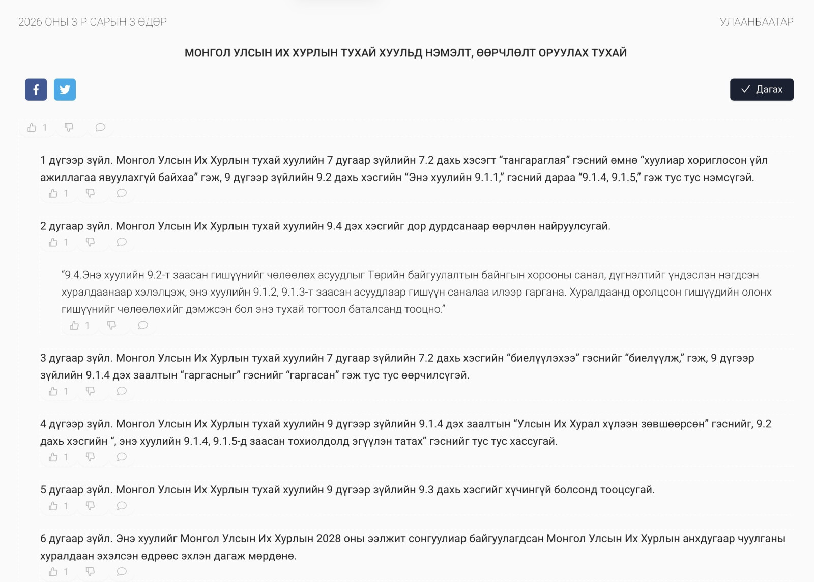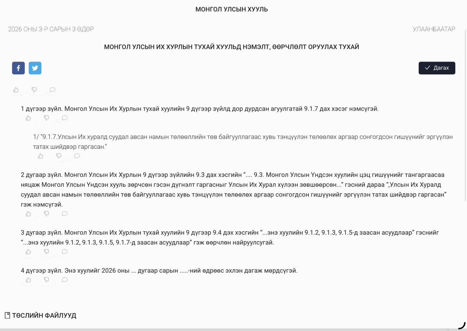 - 1 дүгээр зүйл. Монгол Улсын Их Хурлын тухай хуулийн 7 дугаар зүйлийн 7.2 дахь хэсэгт “тангараглая” гэсний өмнө “хуулиар хориглосон үйл ажиллагаа явуулахгүй байхаа” гэж, 9 дүгээр зүйлийн 9.2 дахь хэсгийн “Энэ хуулийн 9.1.1,” гэсний дараа “9.1.4, 9.1.5,” гэж тус тус нэмсүгэй.