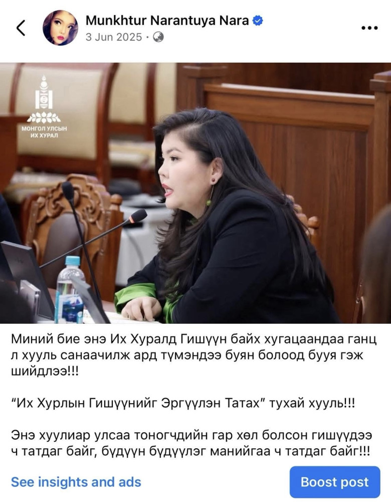 Улмаар 2024 оны сонгуулиар Б.Батбаатараар даргалуулсан ИЗНН-аас жагсаалтаар дөрвөн хүн УИХ-ын гишүүн болсон нь Б.Батбаатар, М.Нарантуяа-Нара, Р.Батболд, С.Замира нар юм. Гэтэл энэ намаас сонгогдсон гишүүн, бүр тодотговол УИХ-ын гишүүн М.Нарантуяа-Нарагийн цахим орчин дахь зүй бус хандлага, ёс бус хэллэг, хараалын үг олны шүүмжлэлийг дагуулж, иргэд ч төрийн эрх барих дээд байгууллага болох УИХ-аас түүнийг “зайлуулах”-ыг шаардаж эхэлсэн.