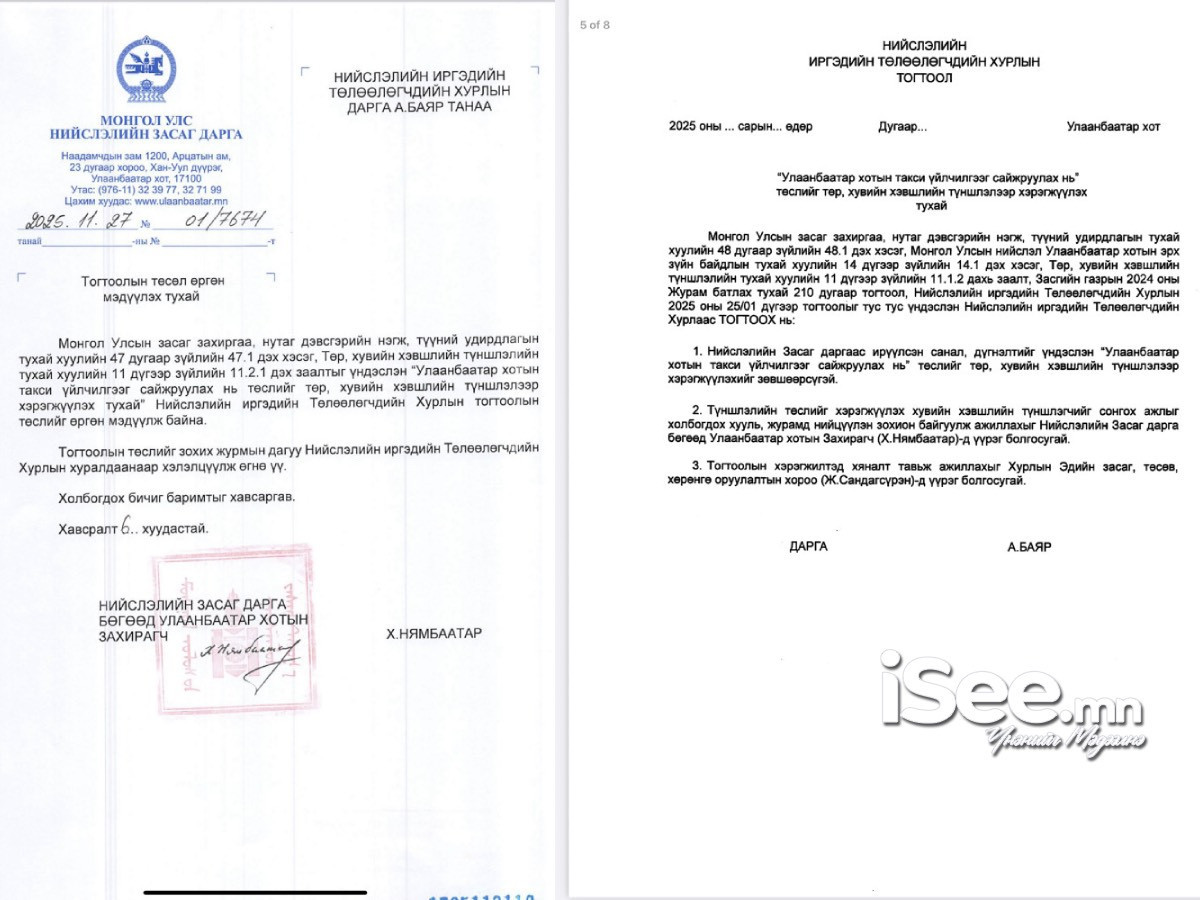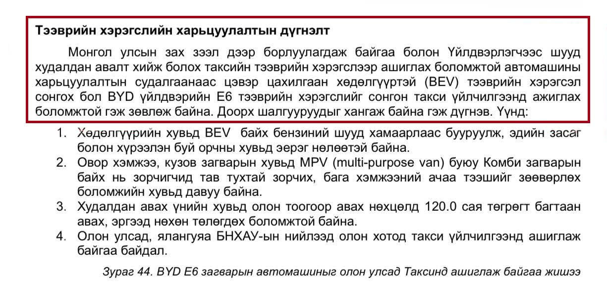 Түүнчлэн “Улаанбаатар хотын хөгжлийн корпораци” ХК-иас “Улаанбаатар хотын такси үйлчилгээг сайжруулах нь” төслийг санаачлан хэрэгжүүлсэн бөгөөд НИТХ-ээр ТЭЗҮ батлагдсан. ТЭЗҮ-д тусгагдсанаар таксины нэг бүрийн үнэ 77 сая төгрөг байх бөгөөд сонгон шалгаруулалтад тэнцсэн компани ямар машин авахаа сонгоно. Жолооч, инженер, техникийн ажилтан зэрэг 4573 хүн байнгын ажлын байртай болно гэжээ. Ямартай ч 2026 онд Улаанбаатар хотод 1000 такси явж эхлэх бөгөөд үүнд нийслэлийн төсвийн 20 тэрбумыг зарцуулах аж. Мөн уг төслийн ТЭЗҮ-д "BYD" үйлдвэрийн "E6" автомашиныг "яг тохирно" хэмээн онцлон дурдаж байсныг энд нэмж өгүүлье.